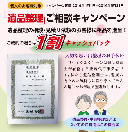 さて今回は弊社HP ( http://www.recycle-clean.co.jp/ ) や弊社の広報誌であるクリン便りVol.31などでもお知らせしている通り ( クリン便りVol.31.PDF ) 、平成28年4月1日から平成28年5月31日の二ヶ月間、個人のお客様を対象に <「遺品整理」ご相談キャンペーン >を実施させていただくことになりました。