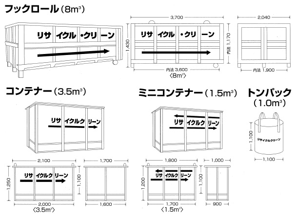 ※大きなゴミ箱をレンタルするような感覚です。物量に応じてサイズの変更が出来ます。 大きさは下の図を参照してください。