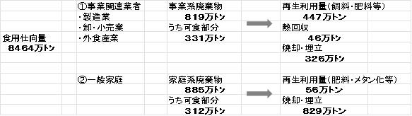 まず、発生状況では食用仕向量(粗食料+加工用原料)8,500万トンのうち実に20%に当たる1,700万トンが廃棄物となっていて、しかも驚くことに650万トンは食べ残しや規格外品、期限切れ廃棄品などの可食部分(これを食品ロスと呼ぶ)です。この食品ロスの650万トンという数字がどの程度の量かということを他の統計と比較してみますと、世界全体の食糧援助量400万トンの1.5倍、コメの国内収穫量850万トンの76%に当たります。なんとも「もったいない」話しです。