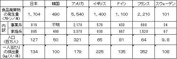 各国における食品廃棄物の発生量と国民一人当たりの食品廃棄物量を比較すると次表の通りです。