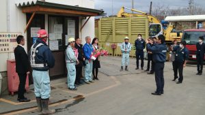 飛散防止養生シートを取り付け、ほこりがたたないように散水しながら、安全第一で作業を行います。
