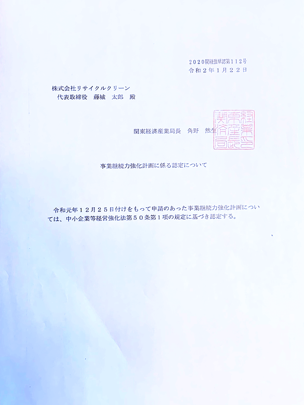 リサイクルクリーン では、令和元年12月に「事業継続力強化計画」の認定を受けました。中小企業が策定した防災・減災の事前対策に関する計画を経済産業大臣が認定する制度で、税制優遇や金融支援、補助金の加点などの支援策が受けられます。