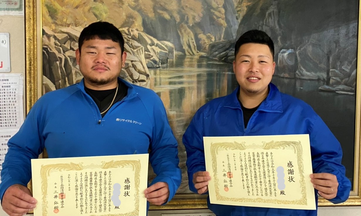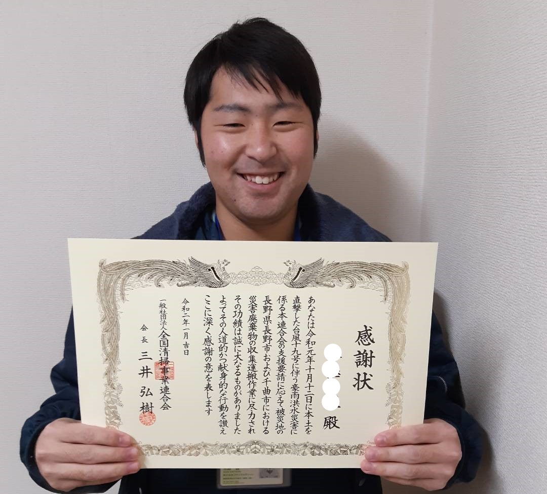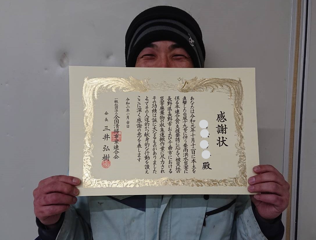 昨年10月、(株)リサイクルクリーンの有志4名が、「令和元年東日本台風」で決壊した長野市の信濃川流域一帯の災害支援活動に参加をいたしました。活動を主催した「一般社団法人 全国清掃事業連合会」より、会社を代表して被災地の復興のお手伝いをさせていただいた4名に感謝状が届きました。