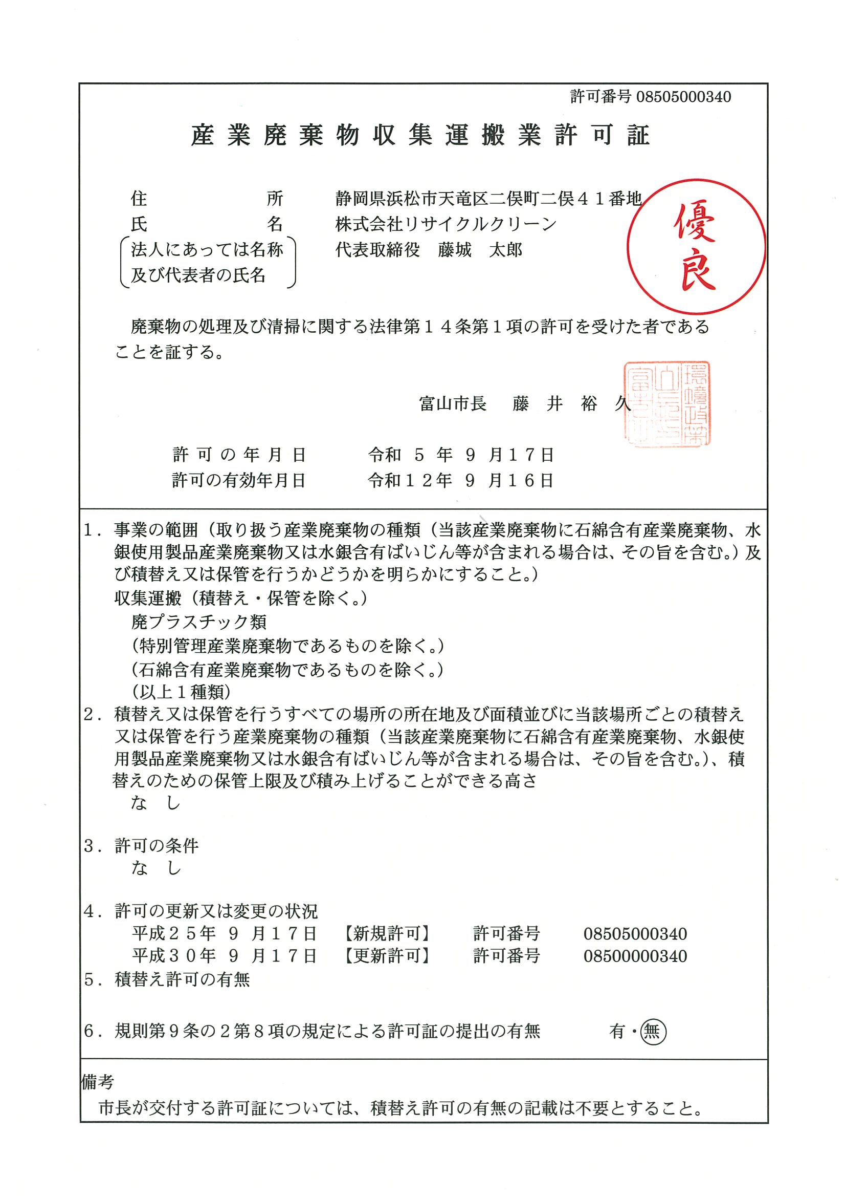 富山市収集運搬業許可証株式会社リサイクルクリーン