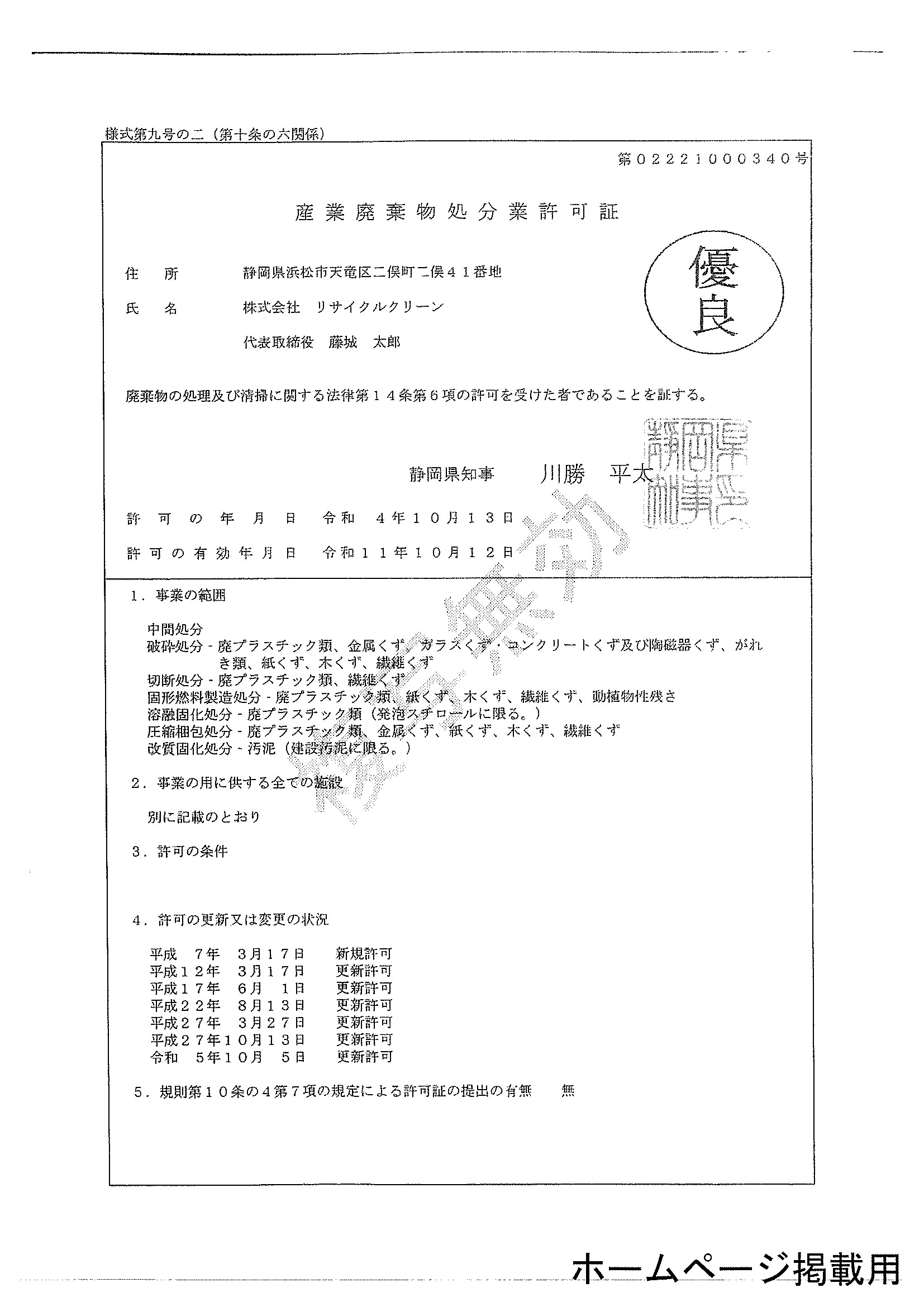 株式会社リサイクルクリーンが静岡県より許可をいただいている産業廃棄物処分業の許可証が更新されました。また、その際「優良産業廃棄物業者」の認定も更新され、有効期限7年での更新となりました。