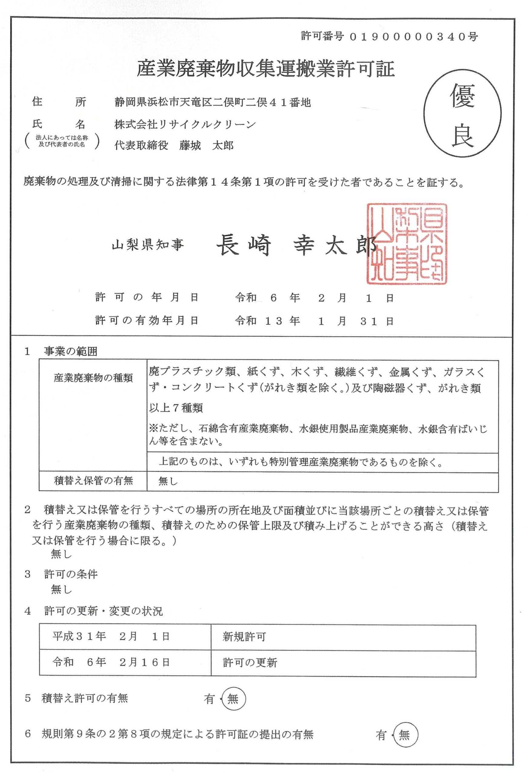 株式会社リサイクルクリーンが山梨県より許可をいただいている産業廃棄物収集運搬業の許可証が更新されました。また、その際「優良産業廃棄物業者」の認定をいただき、有効期限7年での更新となりました。