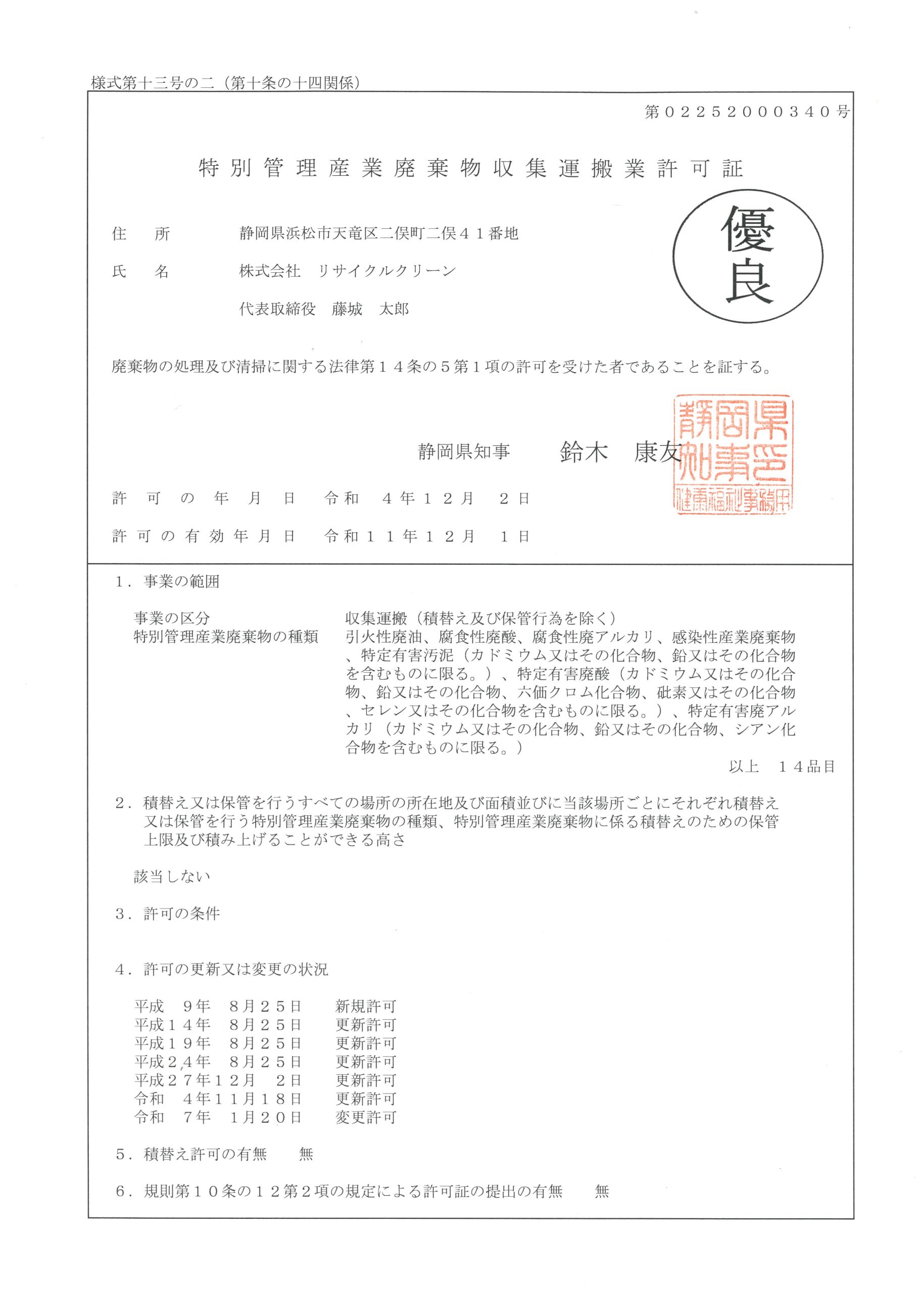 静岡県の特別管理産業廃棄物収集運搬業の許可証の内容が変更になりました。