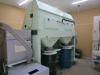 弊社大川工場にある蛍光灯専用破砕機です。上の写真は機械の手前、投入口があります。下の写真は機械の奥側、破砕された物がドラム缶に入ります。最終的に水銀は北海道で処分されます。