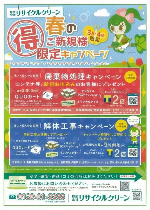 株式会社リサイクルクリーンでは現在、春のマル得ご新規様限定キャンペーンを開催しております。