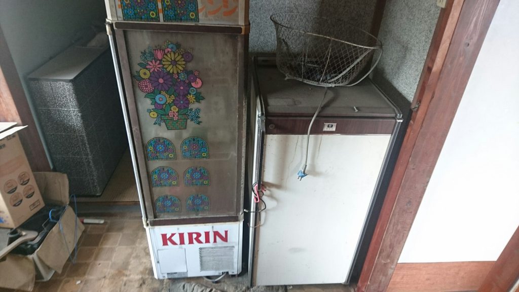 右側の冷蔵庫は、古いですが一般的な家庭用の冷蔵庫です。この冷蔵庫は家電リサイクル法と言う法律で決められた処理をしなければなりません。
