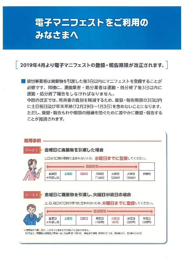2019年4月より電子マニフェストの登録・報告期限が改正されました。
