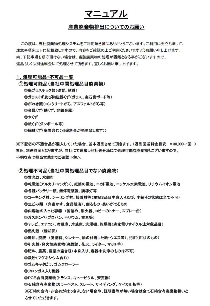 自社では、許可的に処理できない物が多々あります。新規のお客様には契約時に説明文を渡して周知をしていますが、どうしても処理できないも不適合品は入ってきます。