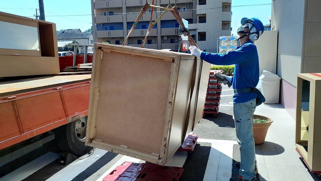 今回はユニック車で吊り上げて作業しました。人力では持ち上げることができない重量物やサイズが大きい物はこの様に帯を使用し回収します。