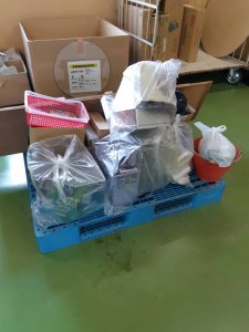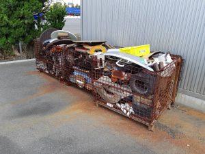 お客様から廃棄の問合せをいただき事務所へ伺うとパレティーナ(鉄製のかご)の中にいろいろなものが保管されていました。少なくとも3年は放置されていたらしく他の廃棄物と共に今回廃棄をすることになったそうです。