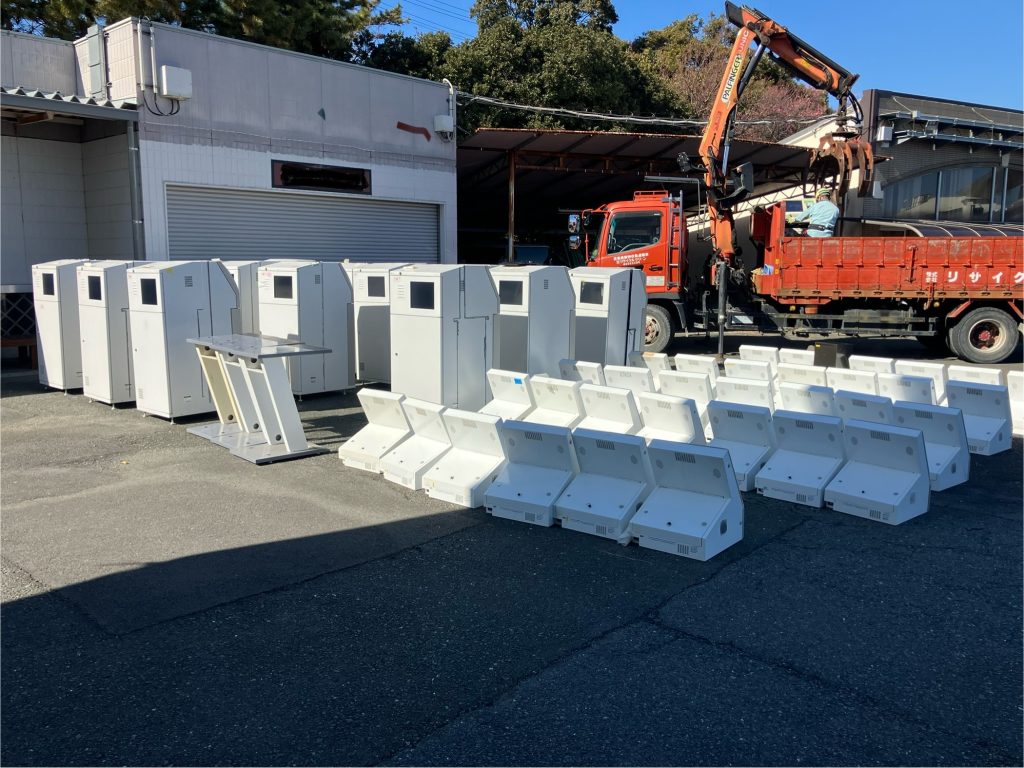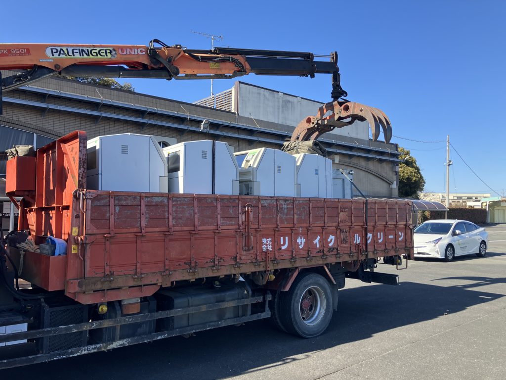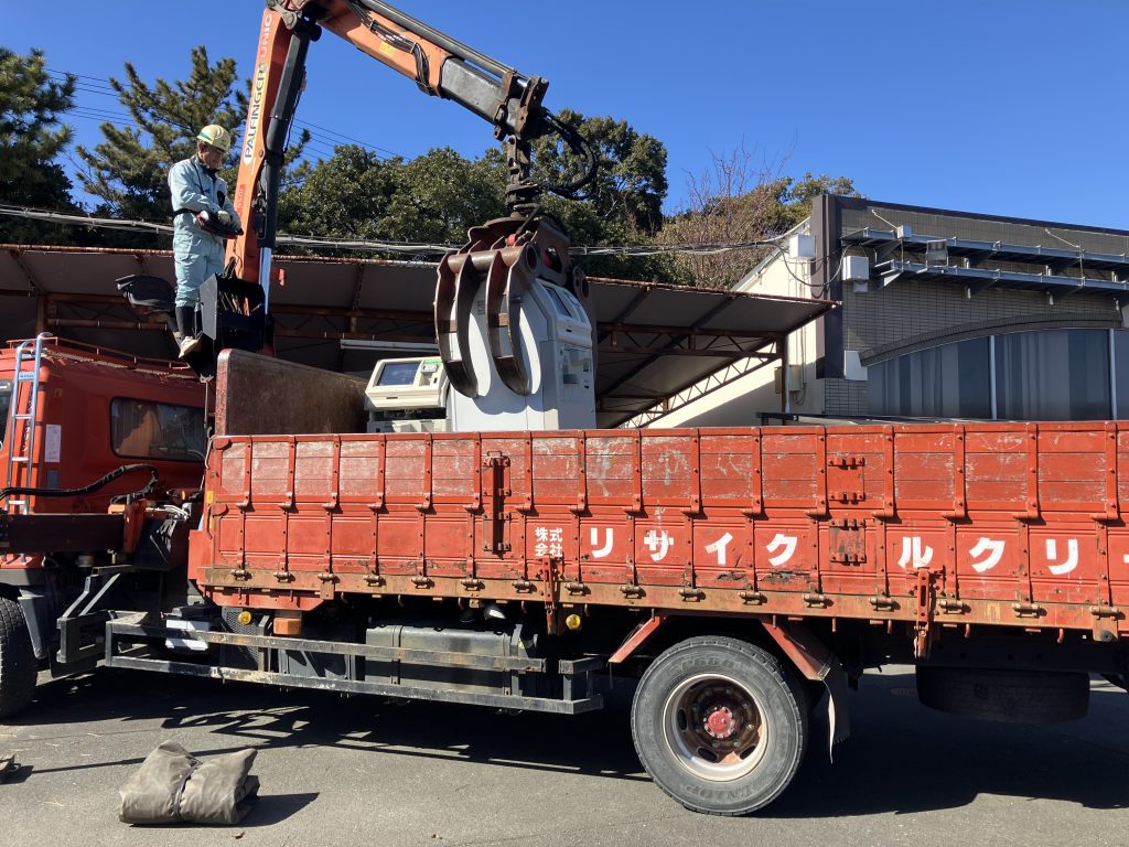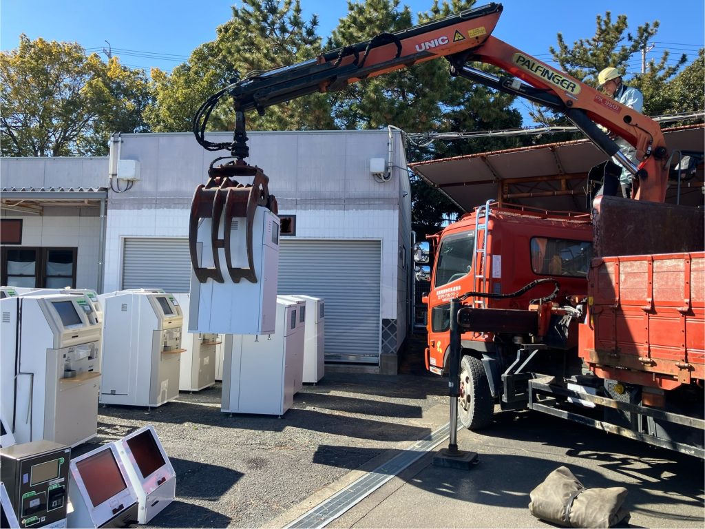 さて、今回は浜松市の2現場にて1台重さ300kgの現金自動預け払い機20台とモニター45台の処分の為に、『ヒアブ車』で積込をしてきました。