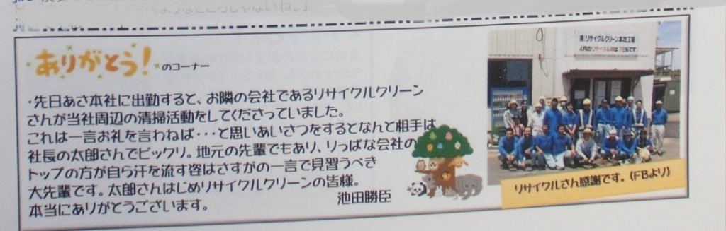 そのイケダヤさんのニュースレター『ふくふくたよりFukuFukuに、リサイクルクリーン本社工場の清掃活動の様子を載せて頂きました!!