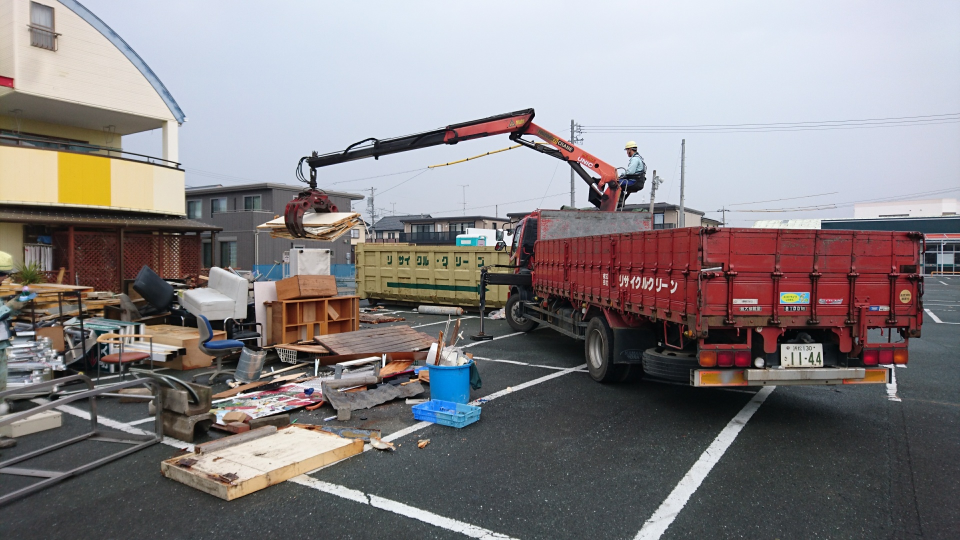 大型のバラ物を掴みながらトラックへ直接積込み可能なヒアブ車。