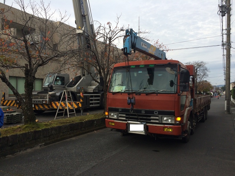 建物屋上の機械をレッカー車にて積み下ろし~回収を行っております。