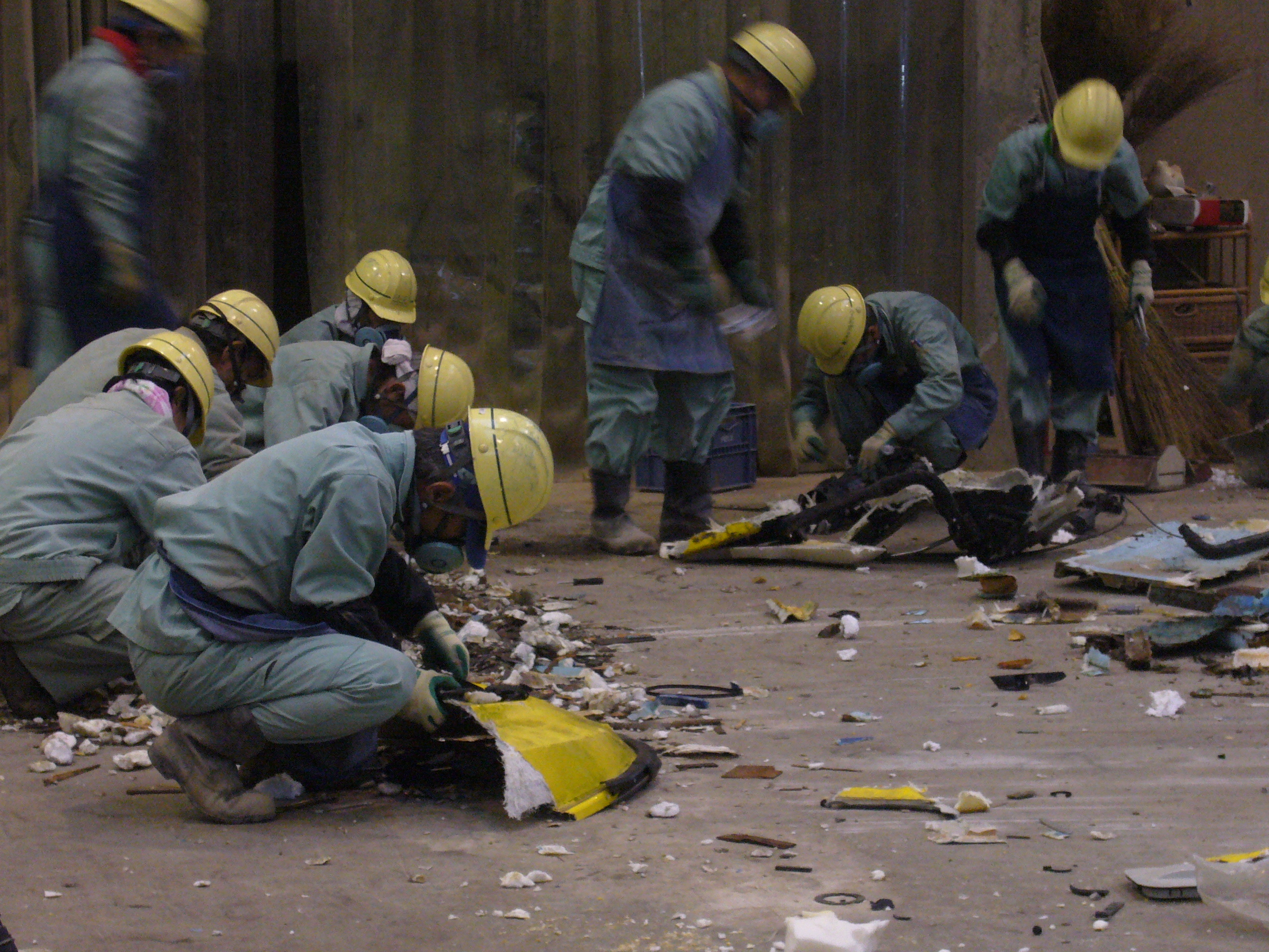上記で説明したような処分の注意点があるため、リサイクルクリーンで処理作業をするときは、長袖・長ズボン・マスク・手袋して作業をします。