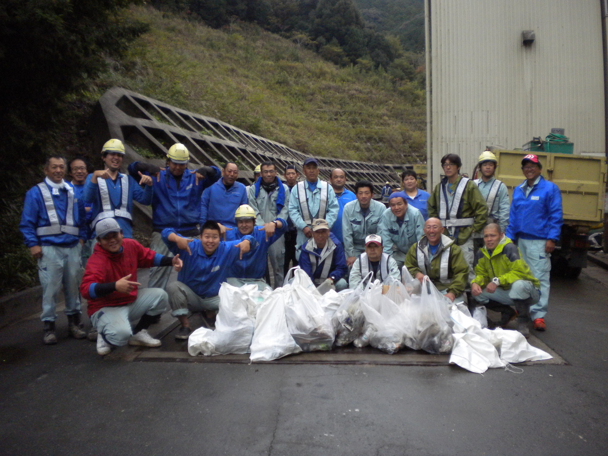 小雨の中、大川工場の傍、船明ダムにかかる歩行者専用の橋の周辺のゴミ拾いを実施しました。
