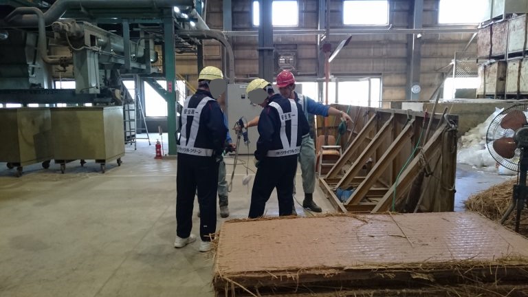 作業風景です、作業内容は固形燃料(RPF)の原料の繊維くず、廃プラスチックを成型機に投入する作業です。とてもまじめに、一生懸命作業をしていただけました。「君たちの作った燃料は、将来、化石燃料の代わりに燃やされるのです」。