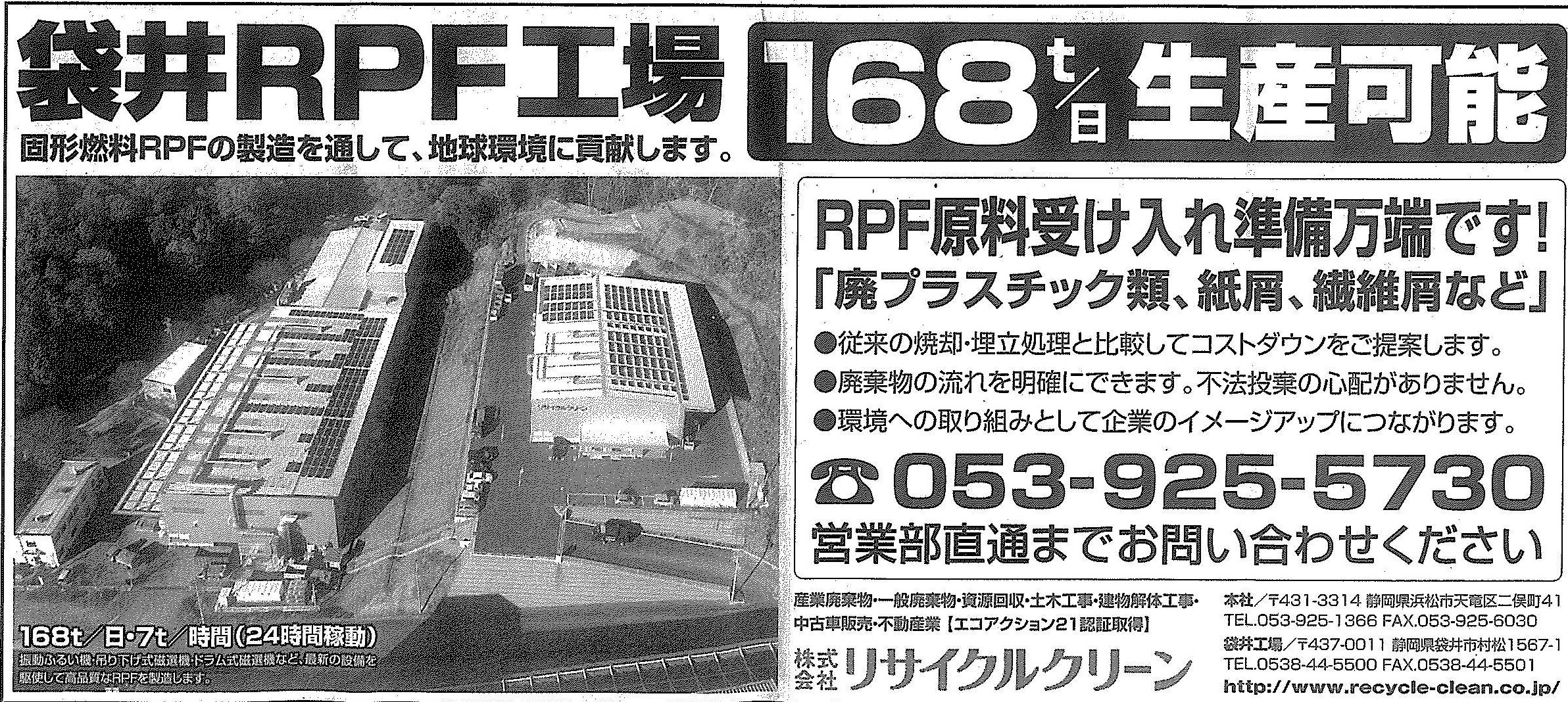 8月6日(月)、循環経済新聞 8月6日版 に(株)リサイクルクリーン袋井RPF工場の広告が掲載されました。弊社では只今24時間体制でRPFの製造を実施しております。RPF製造の原料となる廃棄物の受入についても、常時ご相談を承っております。053-925-5730までお問合せいただければ、速やかに対応させていただきます。よろしくお願い致します。