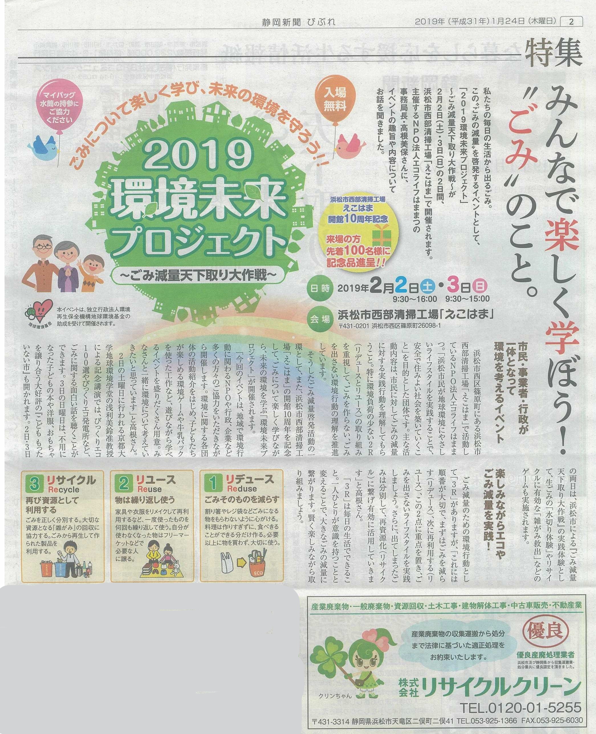 NPO法人エコライフはままつ主催「2019環境未来プロジェクト」(2月2日(土)・3日(日)に浜松西部清掃工場「えこはま」で開催)に協賛させていただきました。この催しは、浜松の市民、事業者、行政が一体となって未来の地球環境を考えるというイベントです。メインのテーマは「ごみの減量」、わたくしども(株)リサイクルクリーンが得意とする分野「Recycle(再利用)」の有効な活用についてもいろいろな観点からの考え方が提案されます。是非、このイベントに参加していただき、「ごみ」の未来について一緒に取り組んで行ければと思っています。