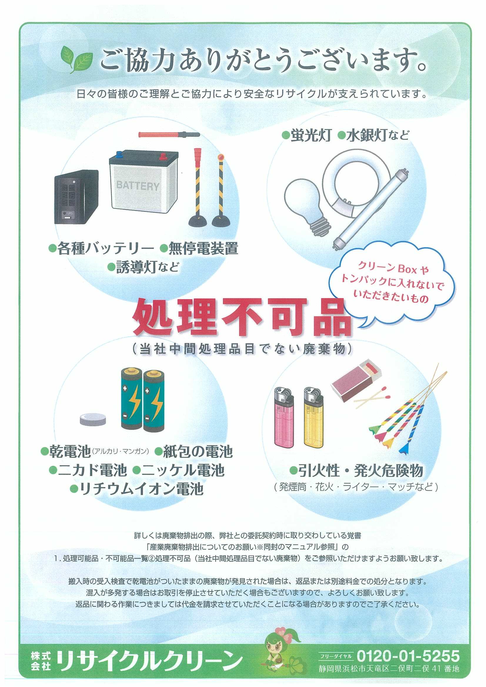 先日、袋井工場にで破砕処理後の廃棄物に混入していた電池から出火という事件がありました。火の取り扱いに関しては、従業員一同細かな気配りを徹底してゆきたいと思います。尚、お取引いただいている皆様にもご理解とご協力をいただきたくお願いいたします。