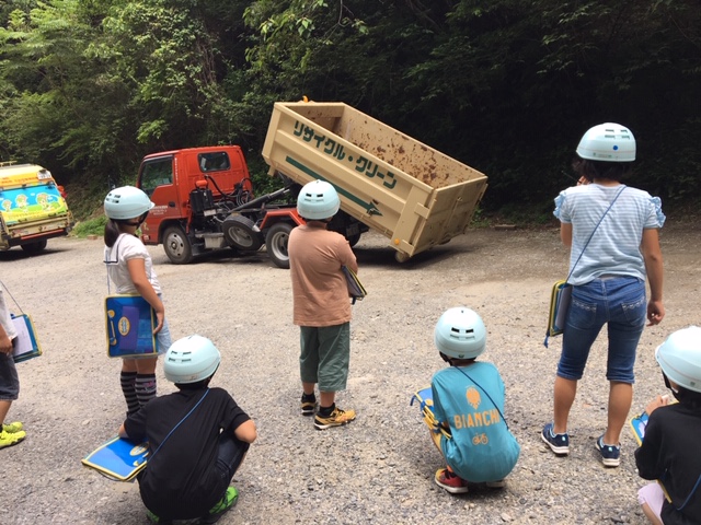 大川工場のアトラクション、入出工場長の出番です。まずはパッカー車の中はどうなってるの?