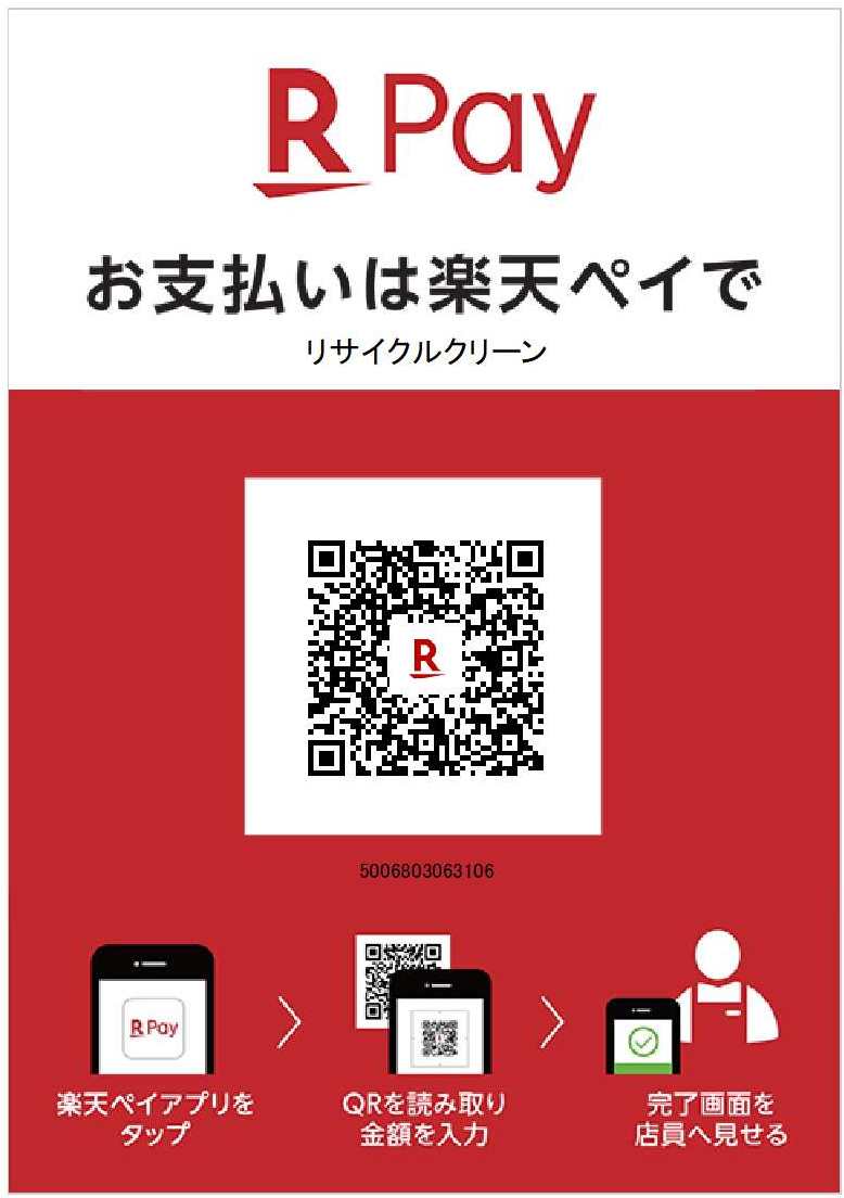 リサイクルクリーンはキャッシュレスにも積極的に対応しています。お支払いは楽天ペイのQRコード決済で。総合満足度No.1の楽天スーパーポイントが貯まります!