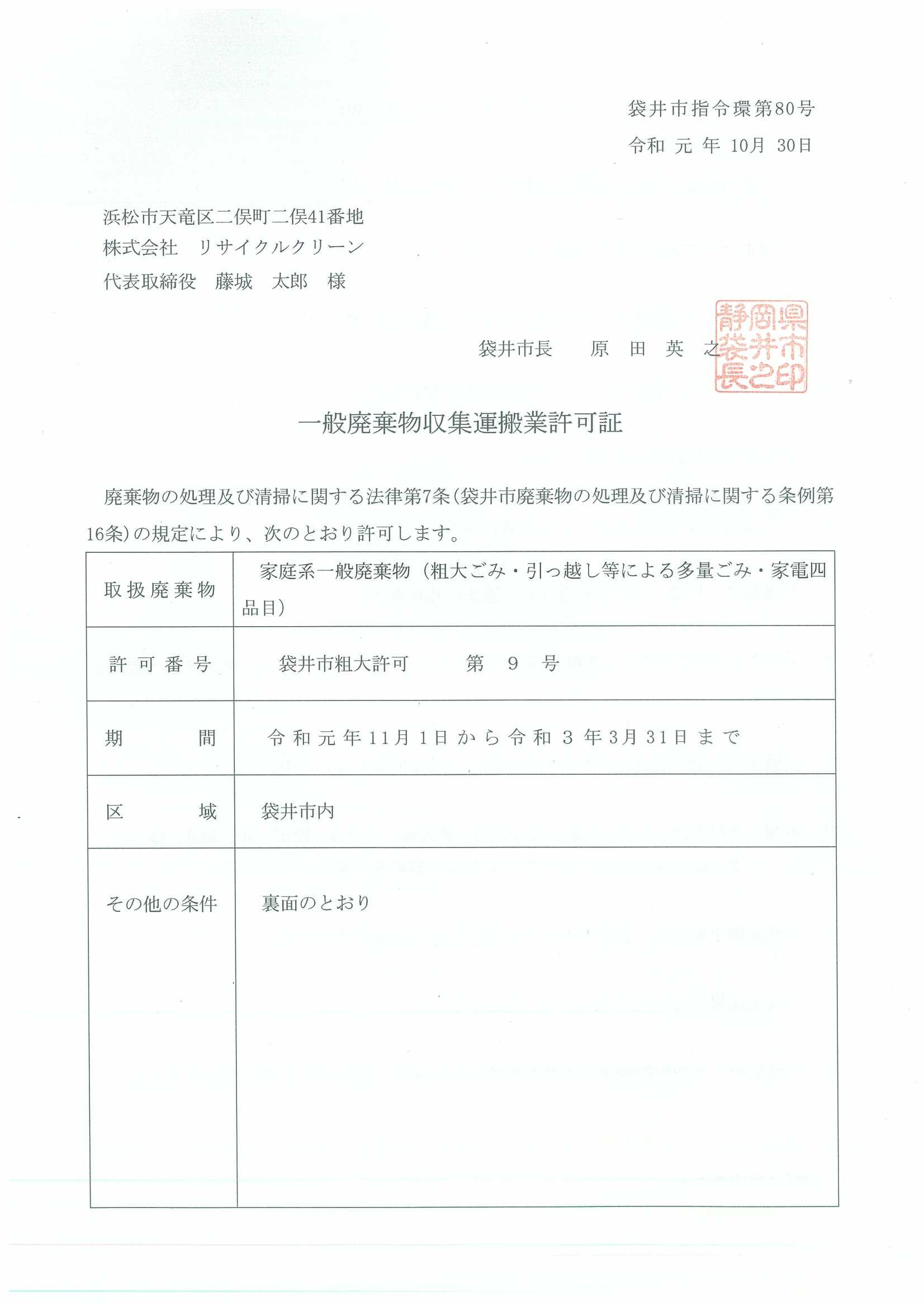 袋井市の家庭系一般廃棄物収集運搬業許可証を取得しました。