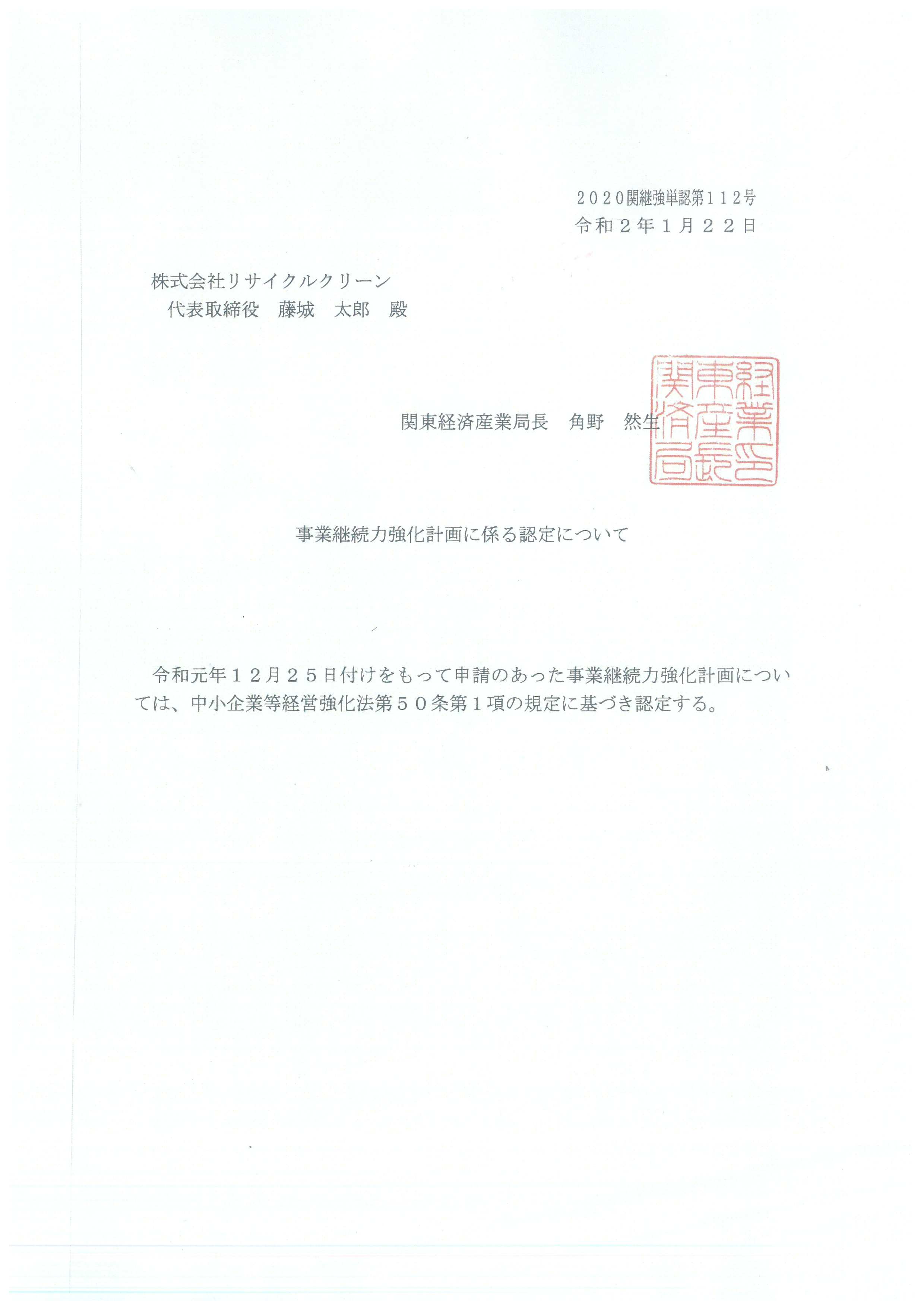株式会社リサイクルクリーンは、令和2年1月22日付で、経済産業省中小企業庁所管の「事業継続力強化計画に係る認定」をいただきました。