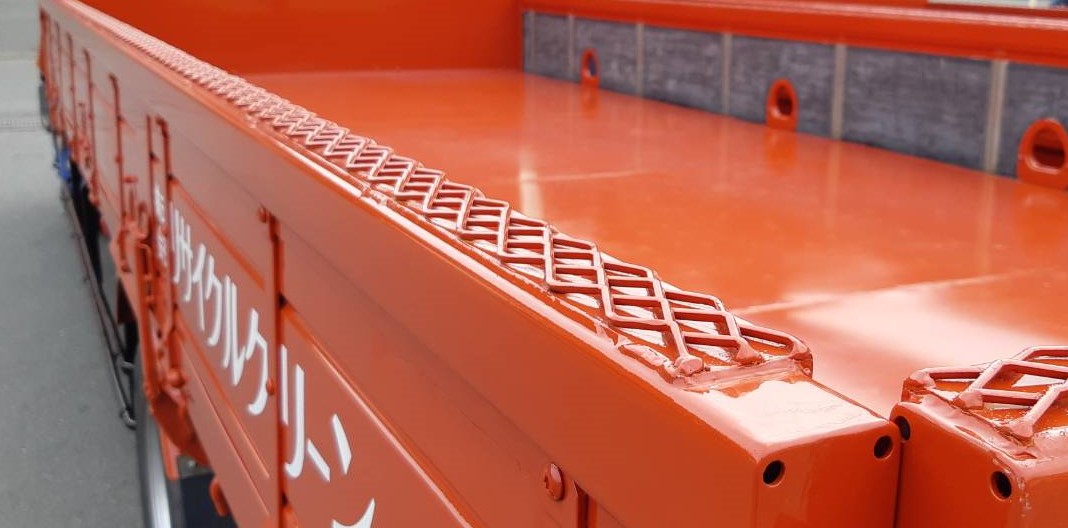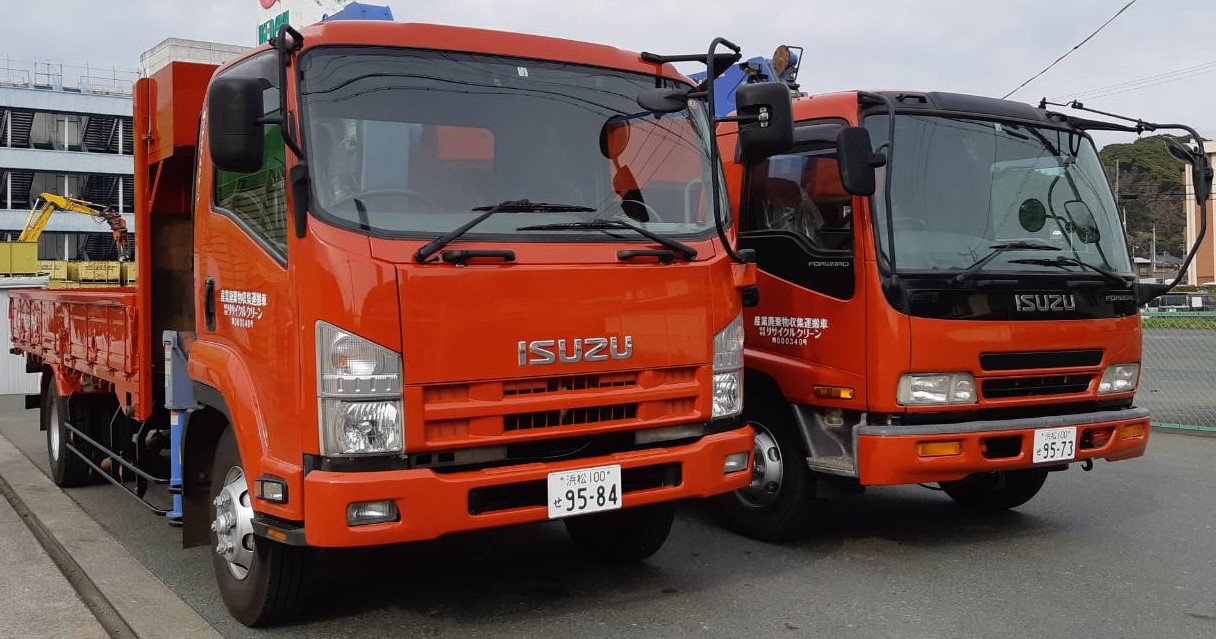 車両は4トン車のロングボディ、3.5㎥のコンテナが3個の運搬が可能です。安全第一、交通ルールの順守、宜しくお願い致します。