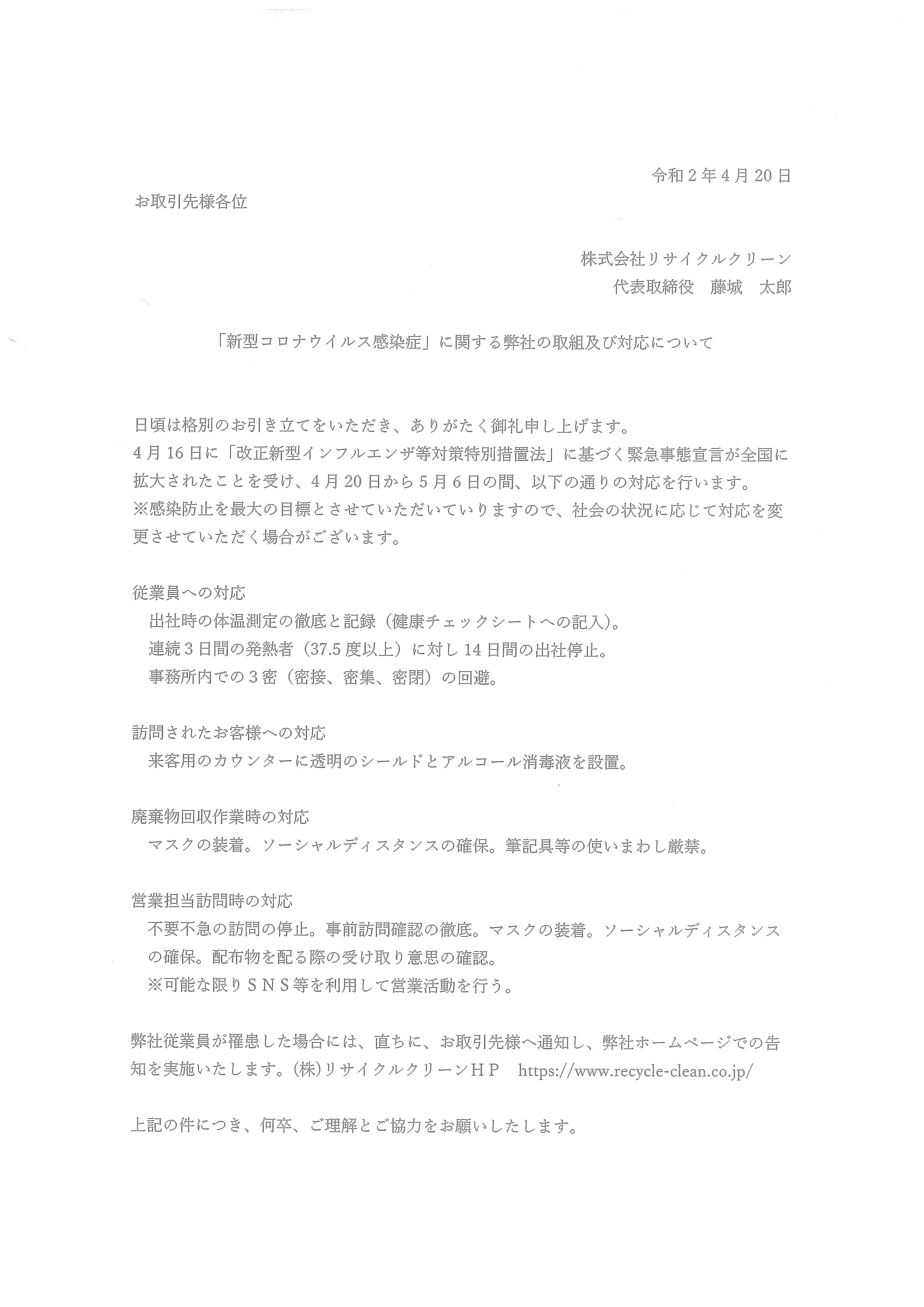 (株)リサイクルクリーン緊急事態宣言を踏まえた新型コロナウイルス感染症に係る廃棄物の円満な処理について
