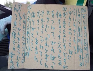 本日、浜松市春野町のごみ集積場に励ましのお便りが置いてありました、そして、とっても幸せな気持ちになりました。どうしてもお知らせをしたくて、担当者のおゆるしをいただいき。弊社ホームページに公開をさせていただきます。