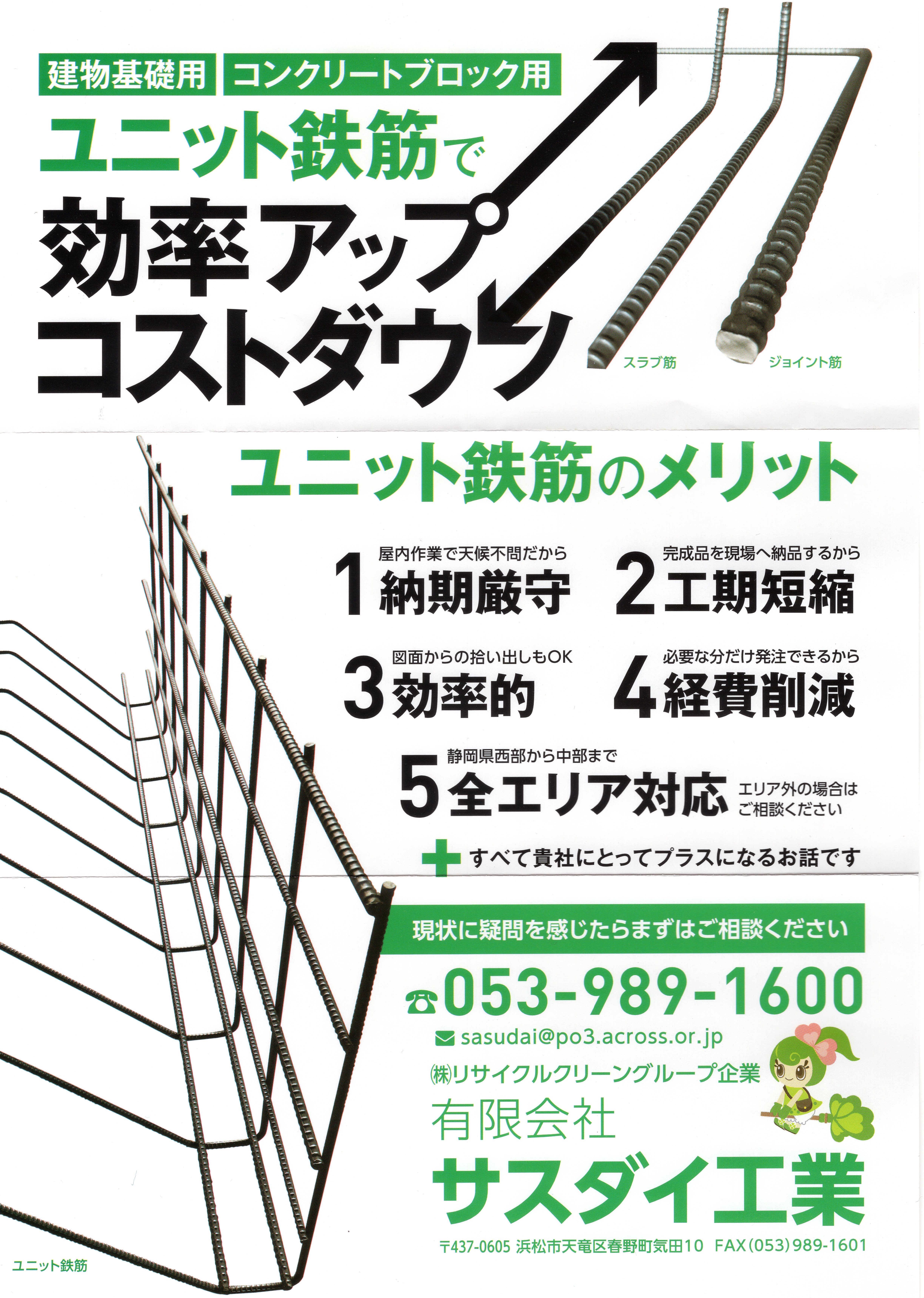 (有)サスダイ工業(株)リサイクルクリーンユニット鉄筋作業効率天竜区春野町費用対効果