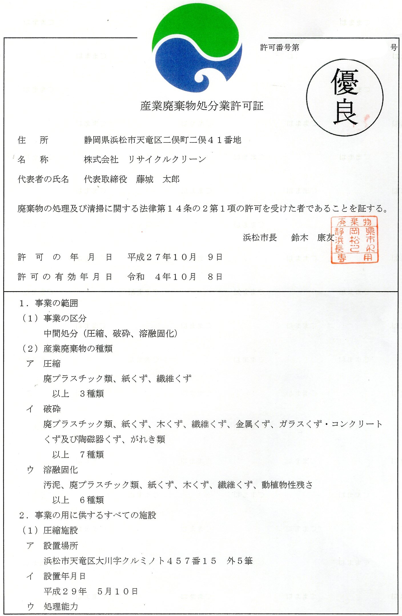 株式会社リサイクルクリーン桜台工場に溶融固化施設(固形燃料(RPF)製造施設)が新設されたため、株式会社リサイクルクリーンの「産業廃棄物処分許可証」*浜松市*に記載されている項目が追加されました。