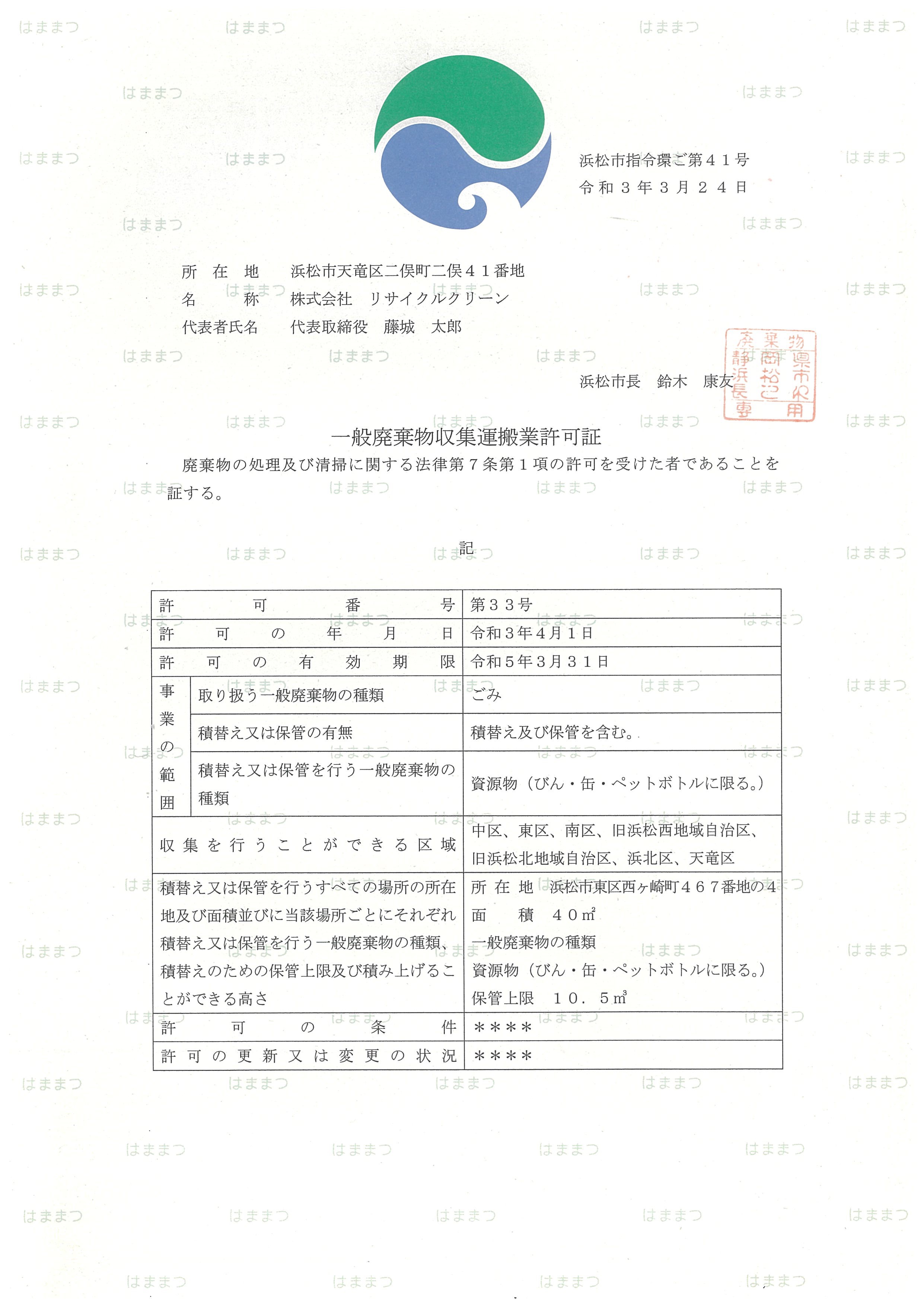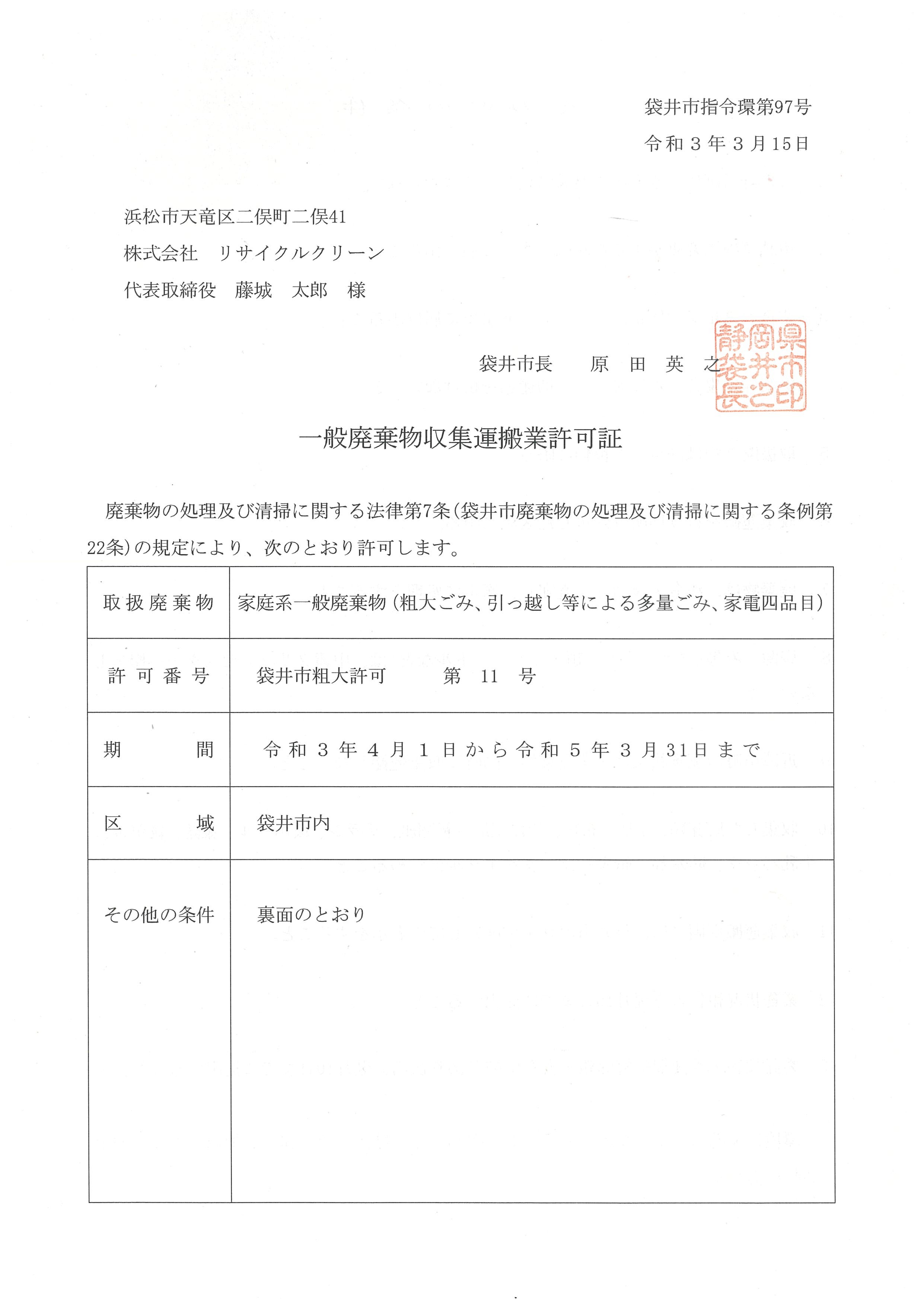 一般廃棄物収集運搬業許可証が更新されました。(浜松市、袋井市)