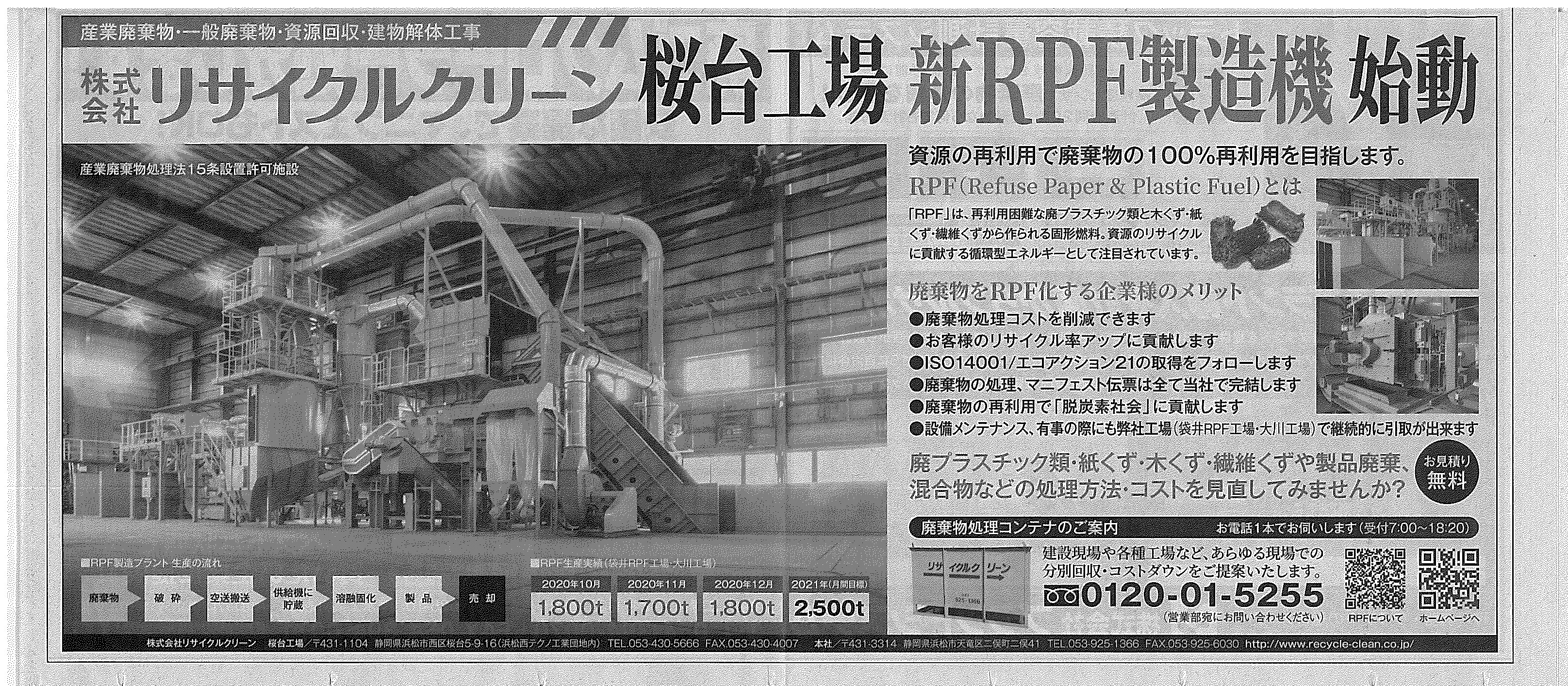 株式会社リサイクルクリーン桜台工場に新たに導入した固形燃料(RPF)製造機の広告を、令和3年3月29日版「週刊循環経済新聞」に掲載しました。