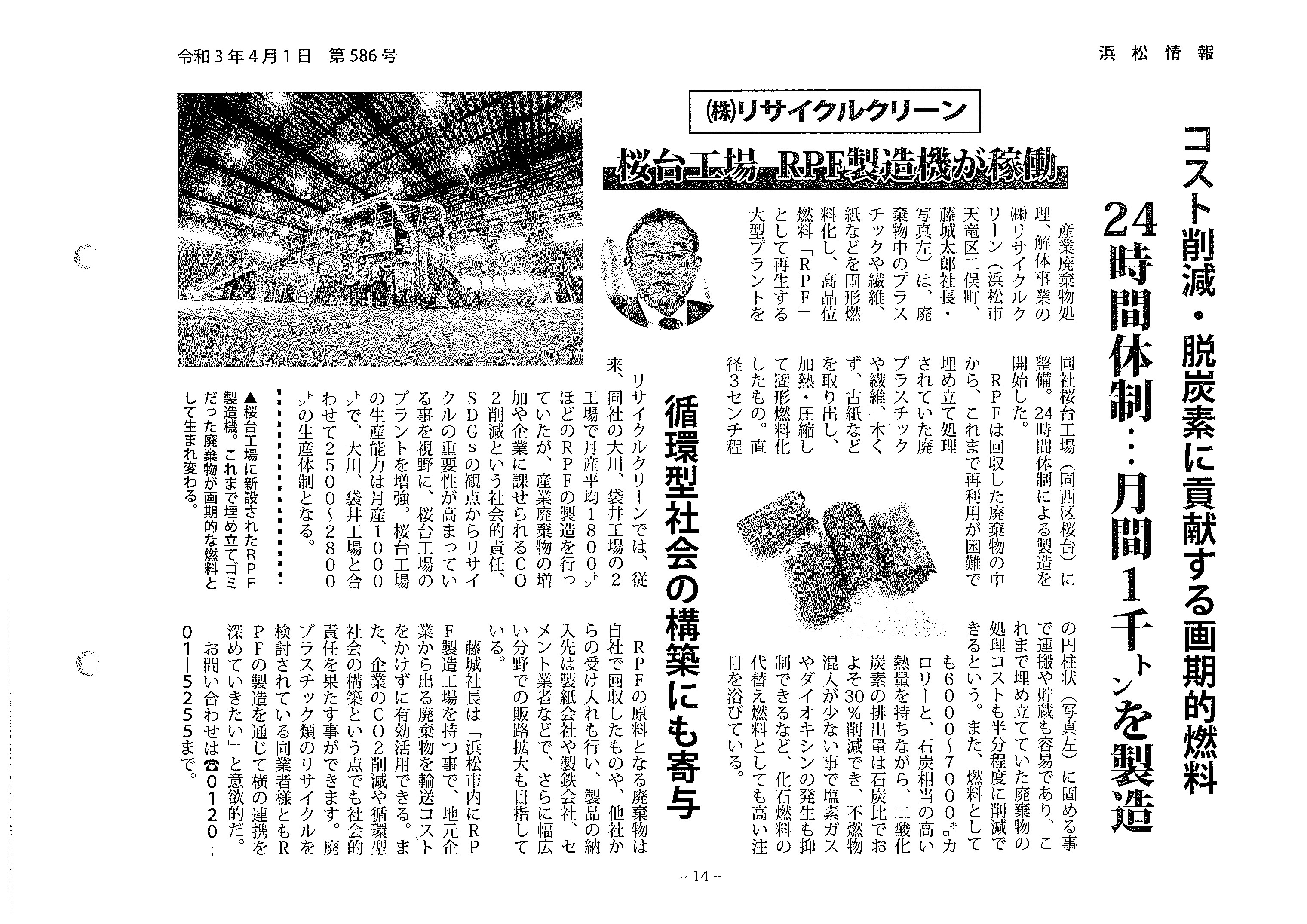 (株)浜松出版が編集、印刷そして発行をしている地方経済の情報誌「浜松情報」第586号に株式会社リサイクルクリーン桜台工場の記事が掲載されました。