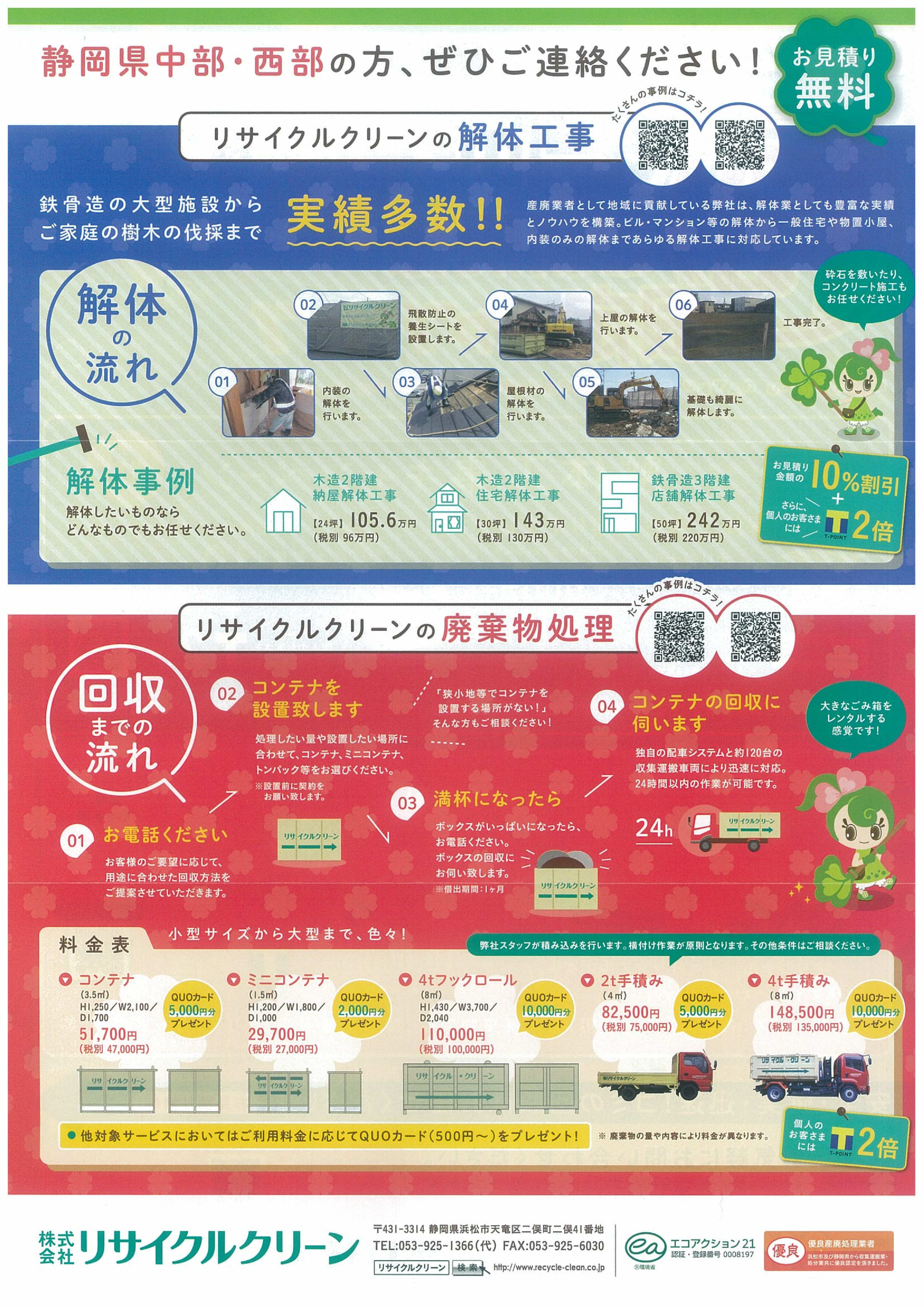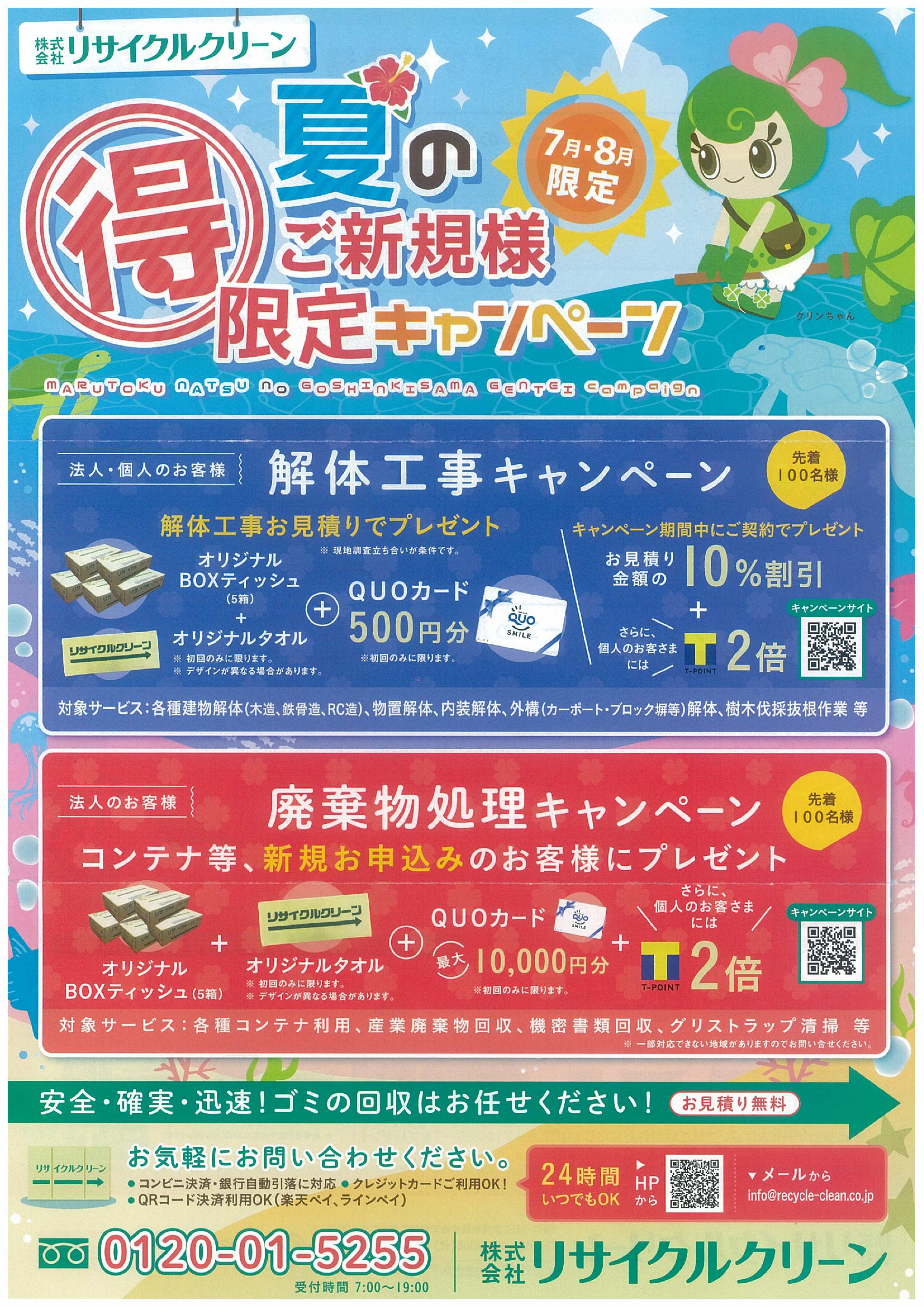 「廃棄物処理キャンペーン」としましては、廃棄物処理に関連した新規にお申し込みされたお客様に対して、オリジナルBOXティッシュ(5箱)、オリジナルタオル、クオカード(最大10,000円)を差し上げます。