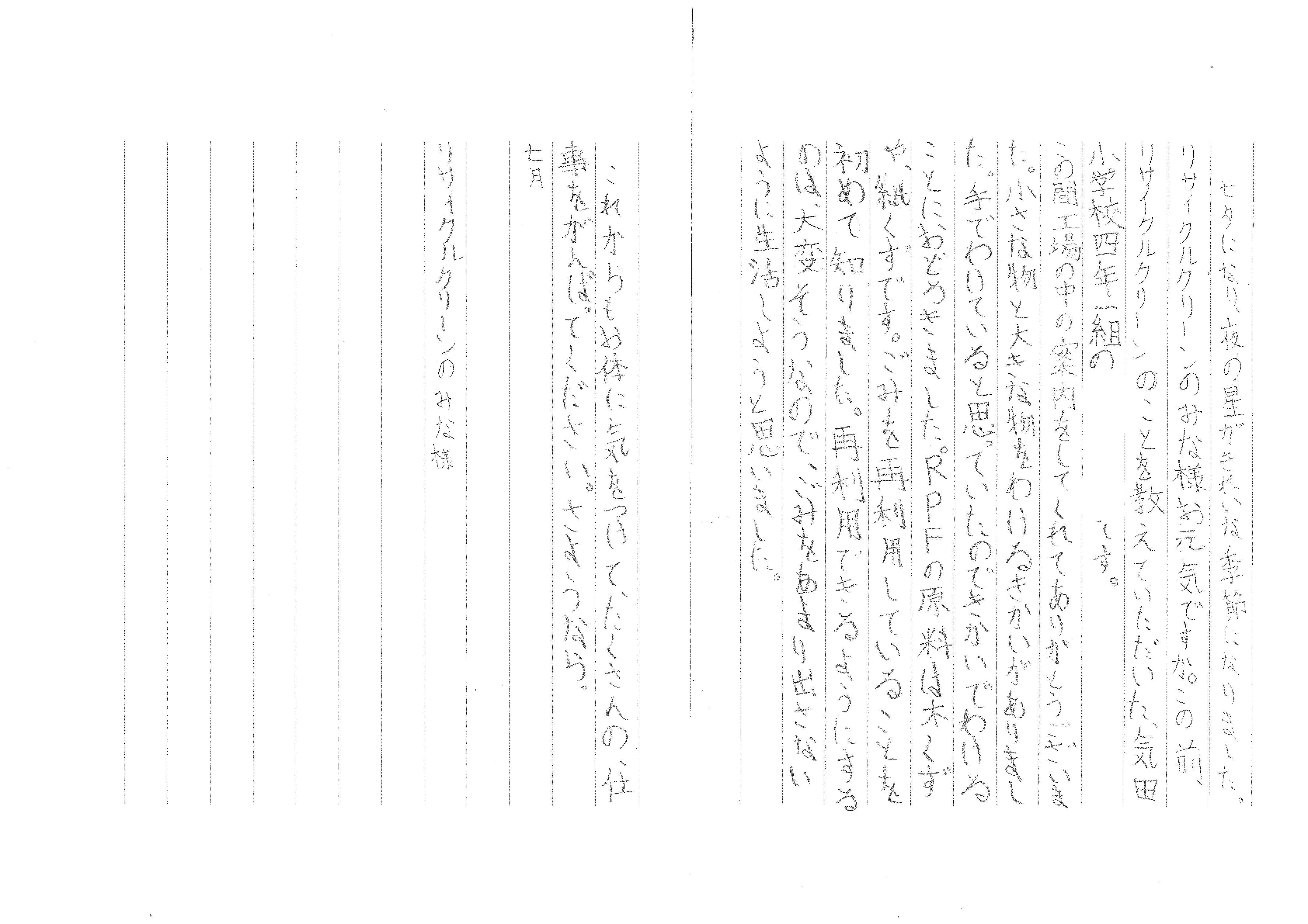 6月1日に株式会社リサイクルクリーン大川工場の工場見学に見えられた浜松市立気田小学校の先生と生徒さんよりお礼状は届きました。早速大川工場に掲示をさせていただきました。世の中が矛盾と閉塞感に覆われ、仕事と娯楽が奪われていく中で、皆様から届いたエールは少し沈んだ心を奮い立たせてくれます。ありがとうございました。