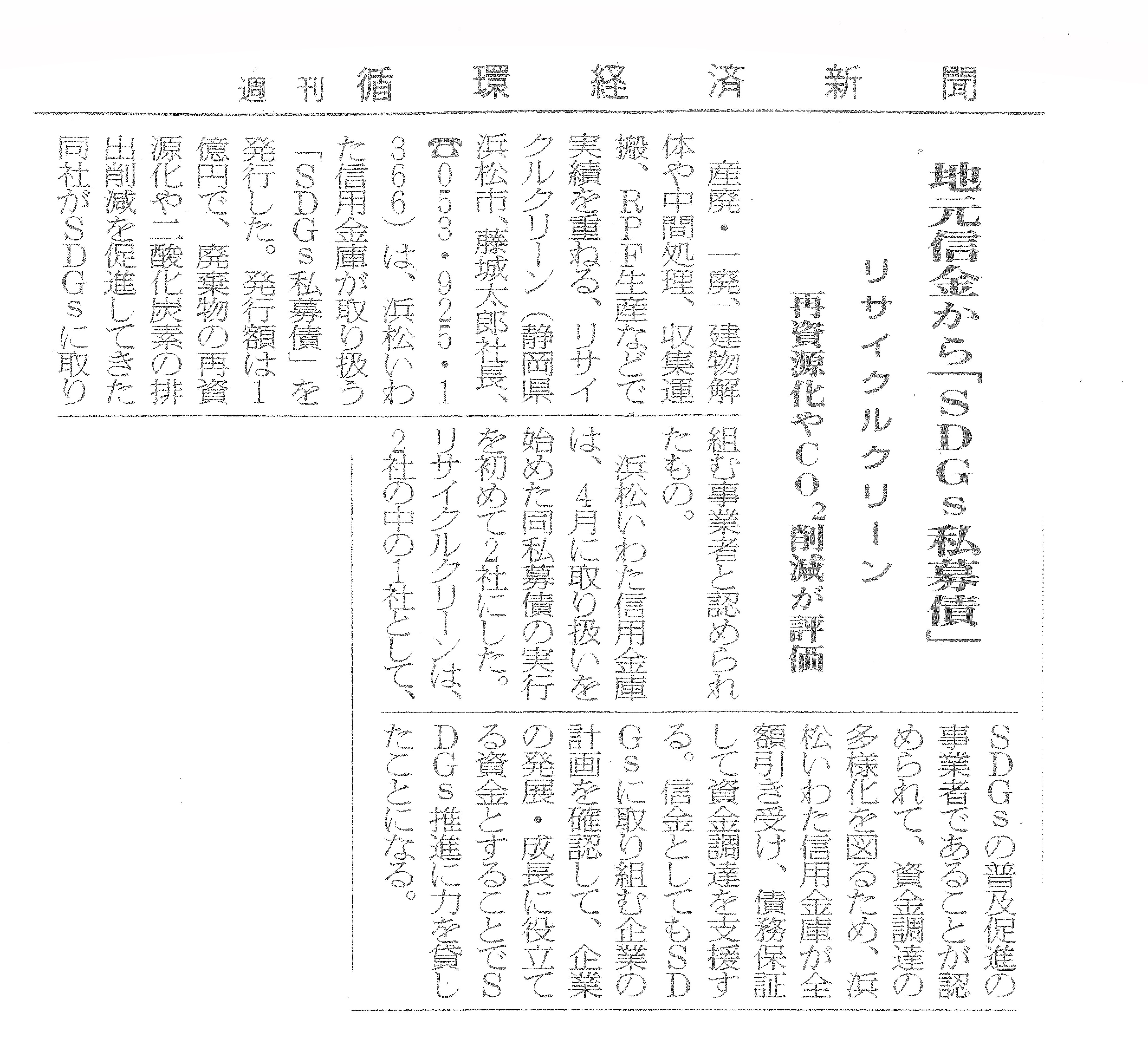 8月16日版、週刊循環経済新聞に株式会社リサイクルクリーンが、浜松いわた信用金庫様にてお取り扱いいただいている「SDGs私募債」についての記事が掲載されました。