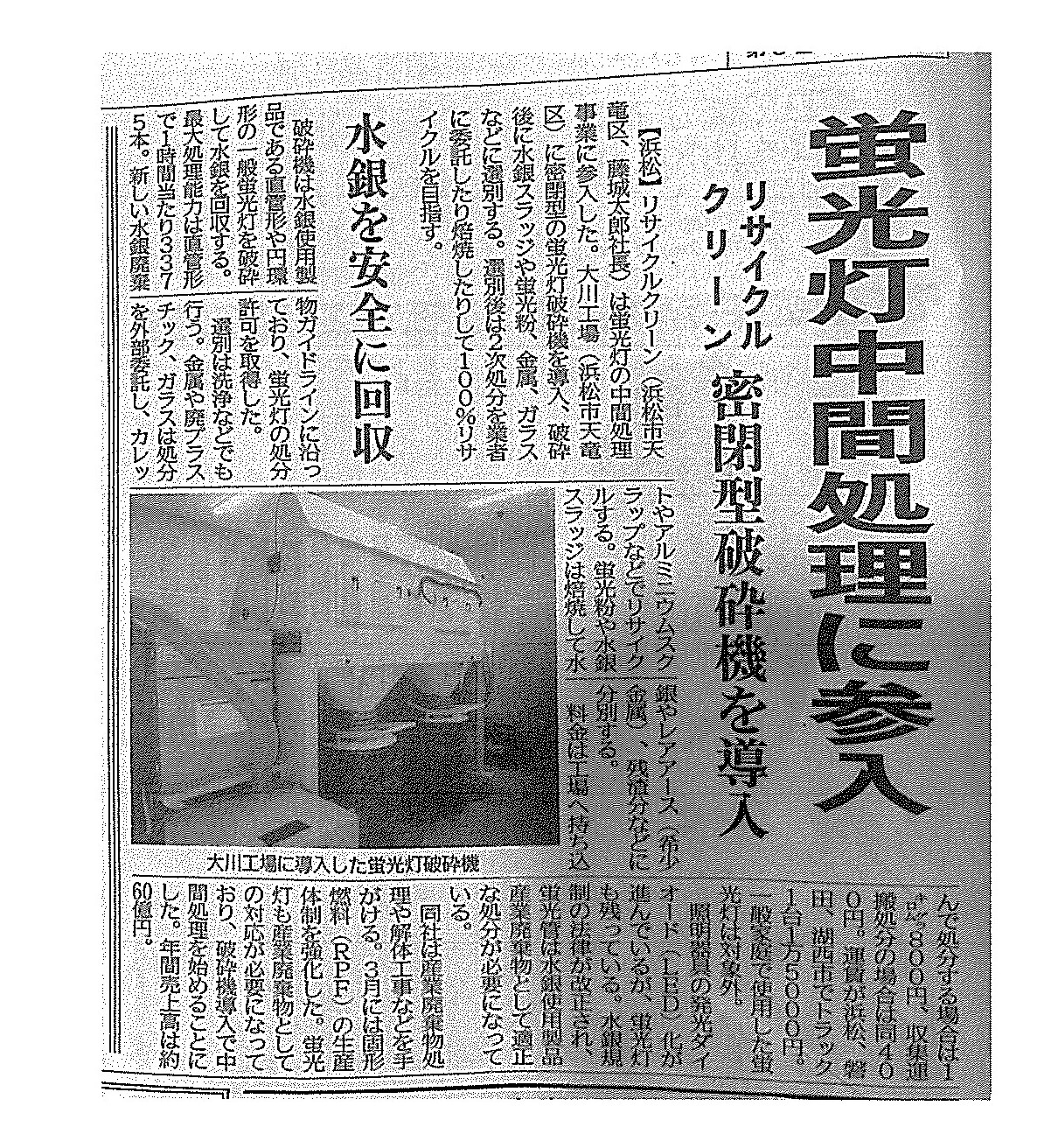 日刊工業新聞株式会社リサイクルクリーン大川工場水銀使用製品産業廃棄物蛍光灯