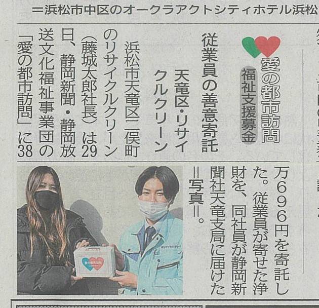 静岡新聞・静岡放送文化福祉事業団の「愛の都市訪問」に株式会社リサイクルクリーンの社員、お取引先などの関係者各位からいただいた募金(各事業所の今年一年分)、を寄託させていただきました。