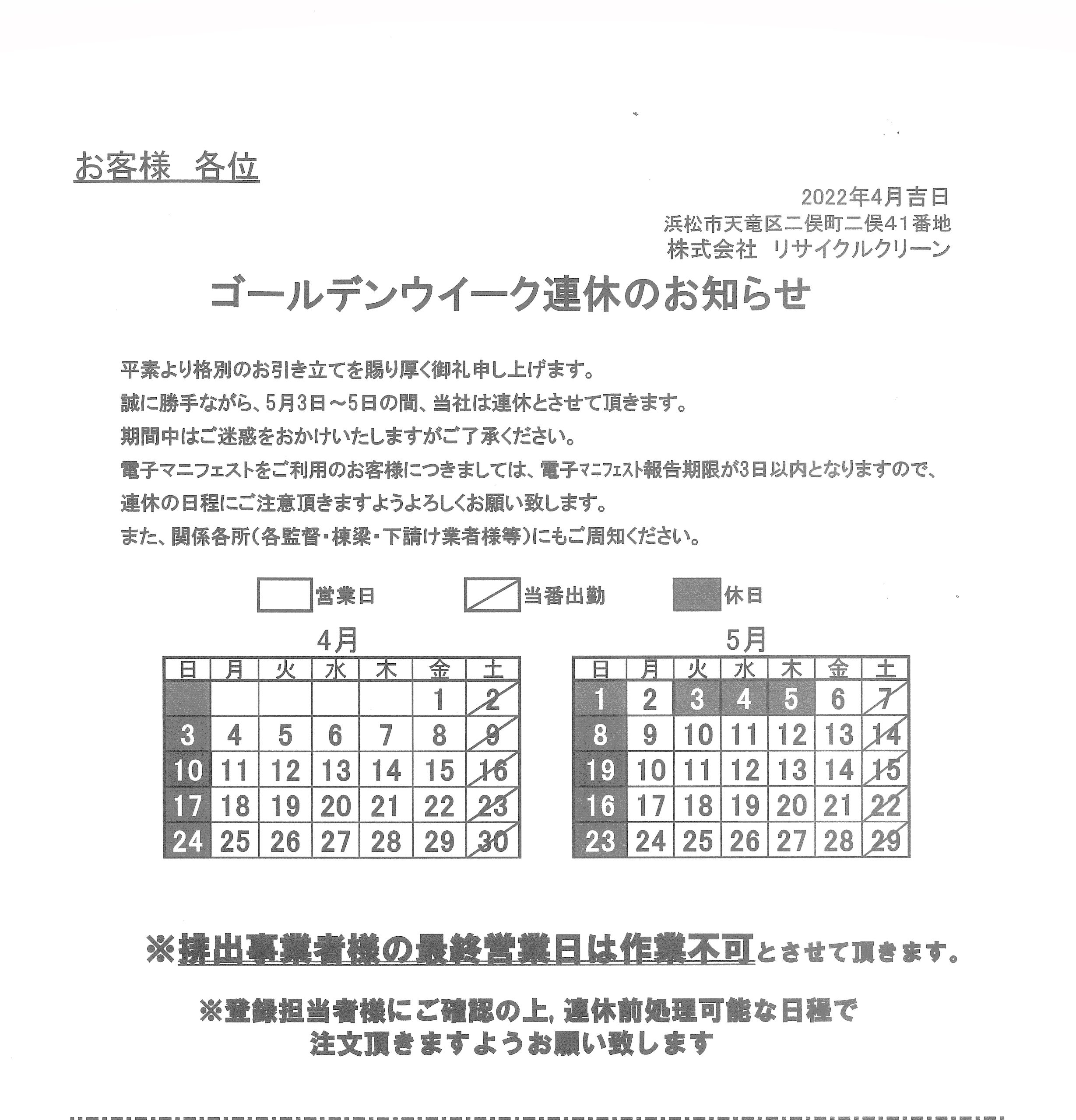 | ●産業廃棄物処分業 | 静岡県第02221000340号 浜松市第06321000340号 |