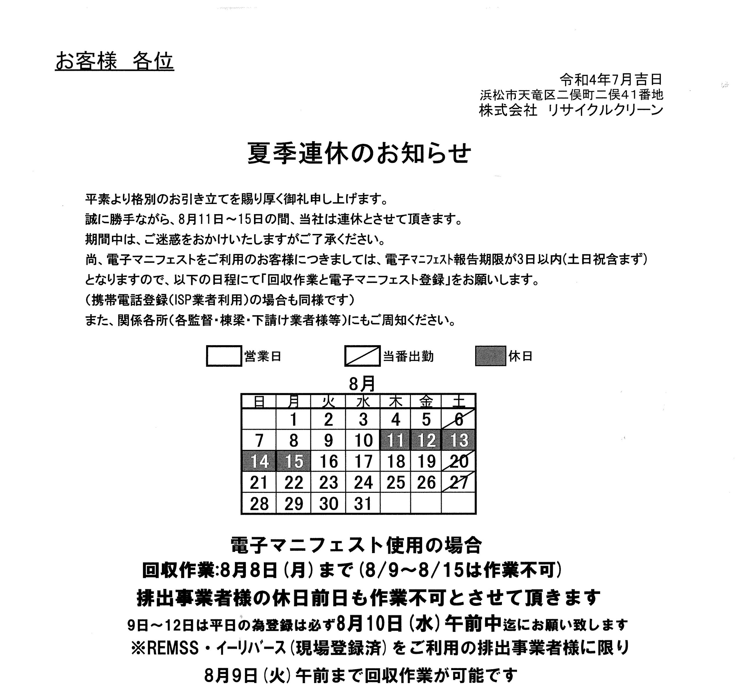 2022年、株式会社リサイクルクリーン夏季休暇のお知らせです。