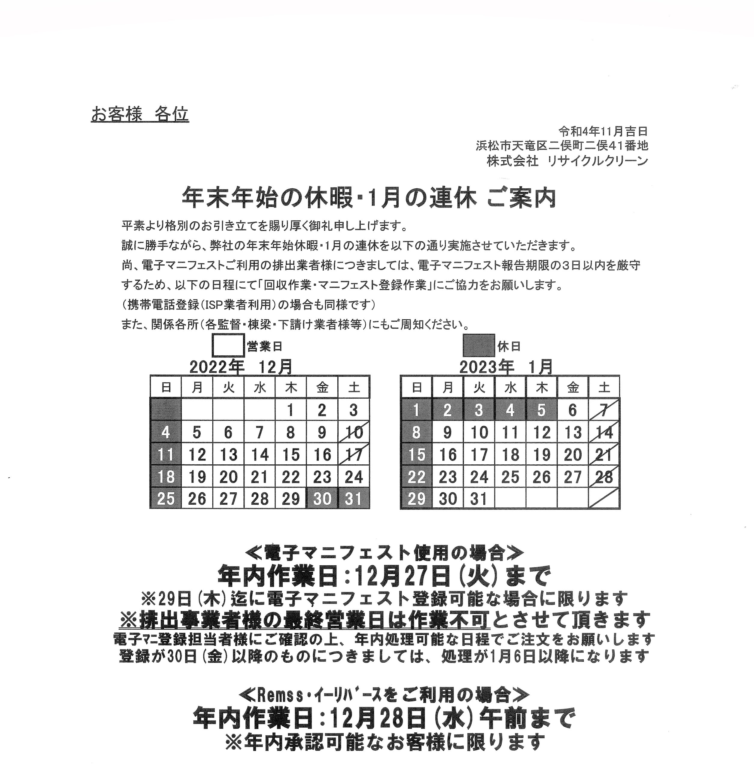 株式会社リサイクルクリーン令和4年度の年末年始営業日程及び電子マニフェスト作業についての連絡です。