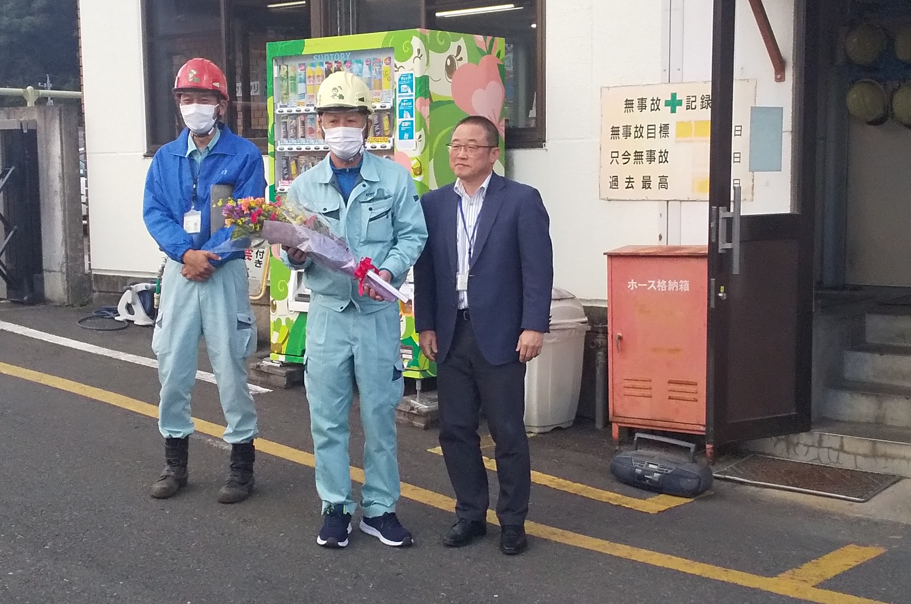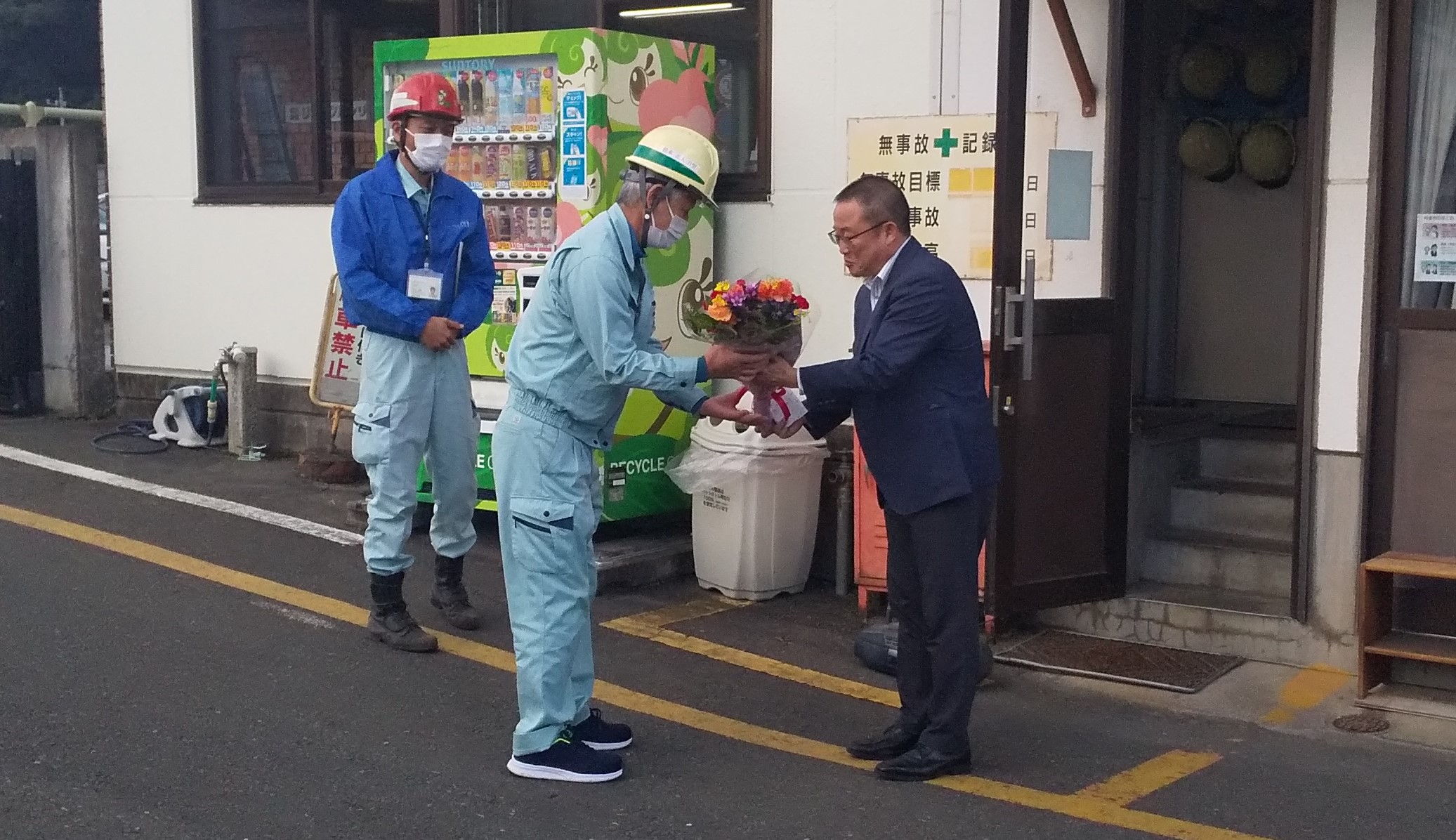 株式会社リサイクルクリーン本社工場所属の松本正人さんが10月20日をもって滿65歳の定年退職となりました。本日、ささやかに花束贈呈のセレモニーを行いました。プレゼンターは代表取締役、露払いは本社工場長です。
