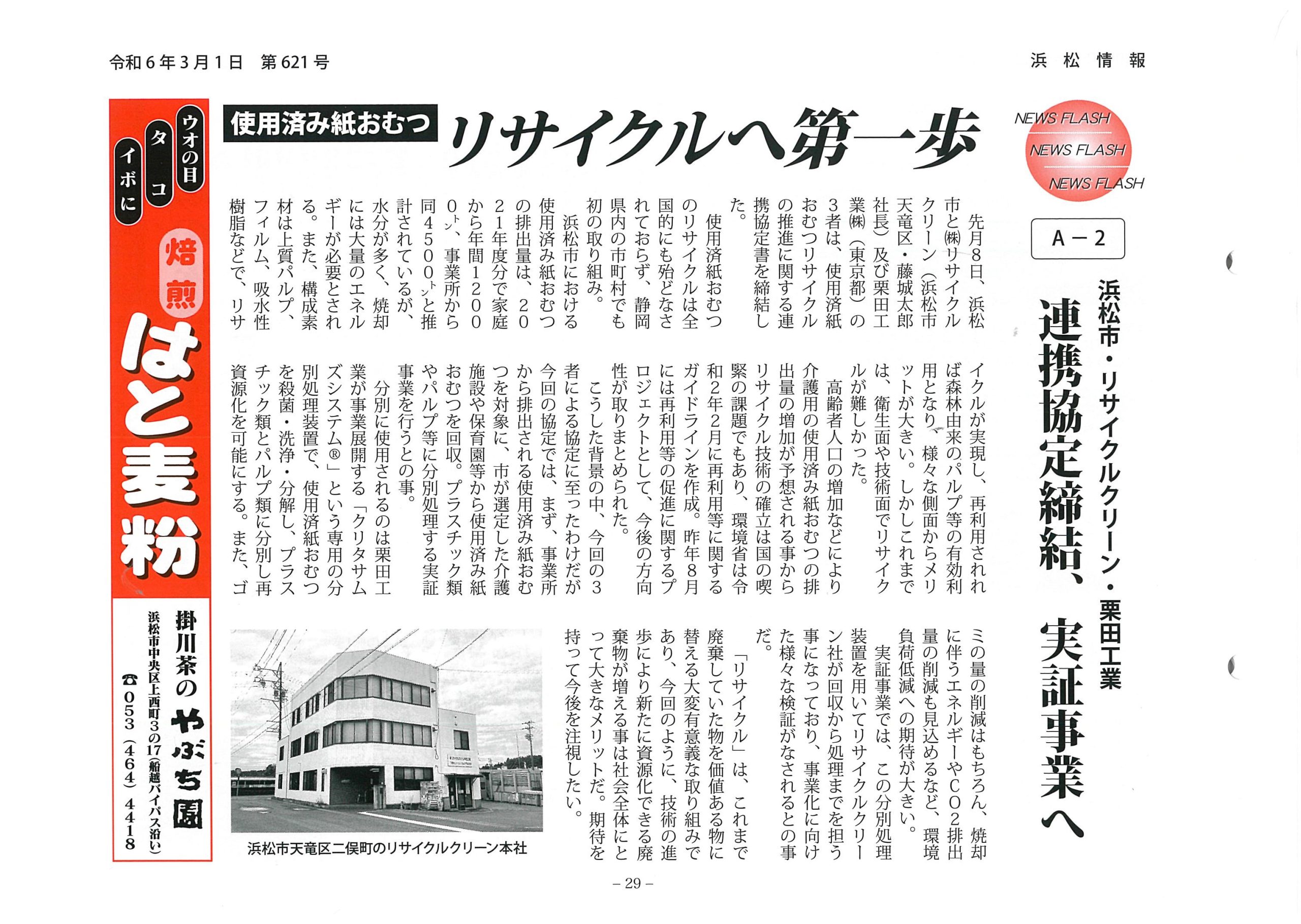 株式会社浜情出版社発行の月間誌「浜松情報」に、浜松市、栗田工業株式会社、株式会社リサイクルクリーンの3者による「使用済み紙おむつリサイクルの推進」に関する連携協定締結の記事が掲載されました。